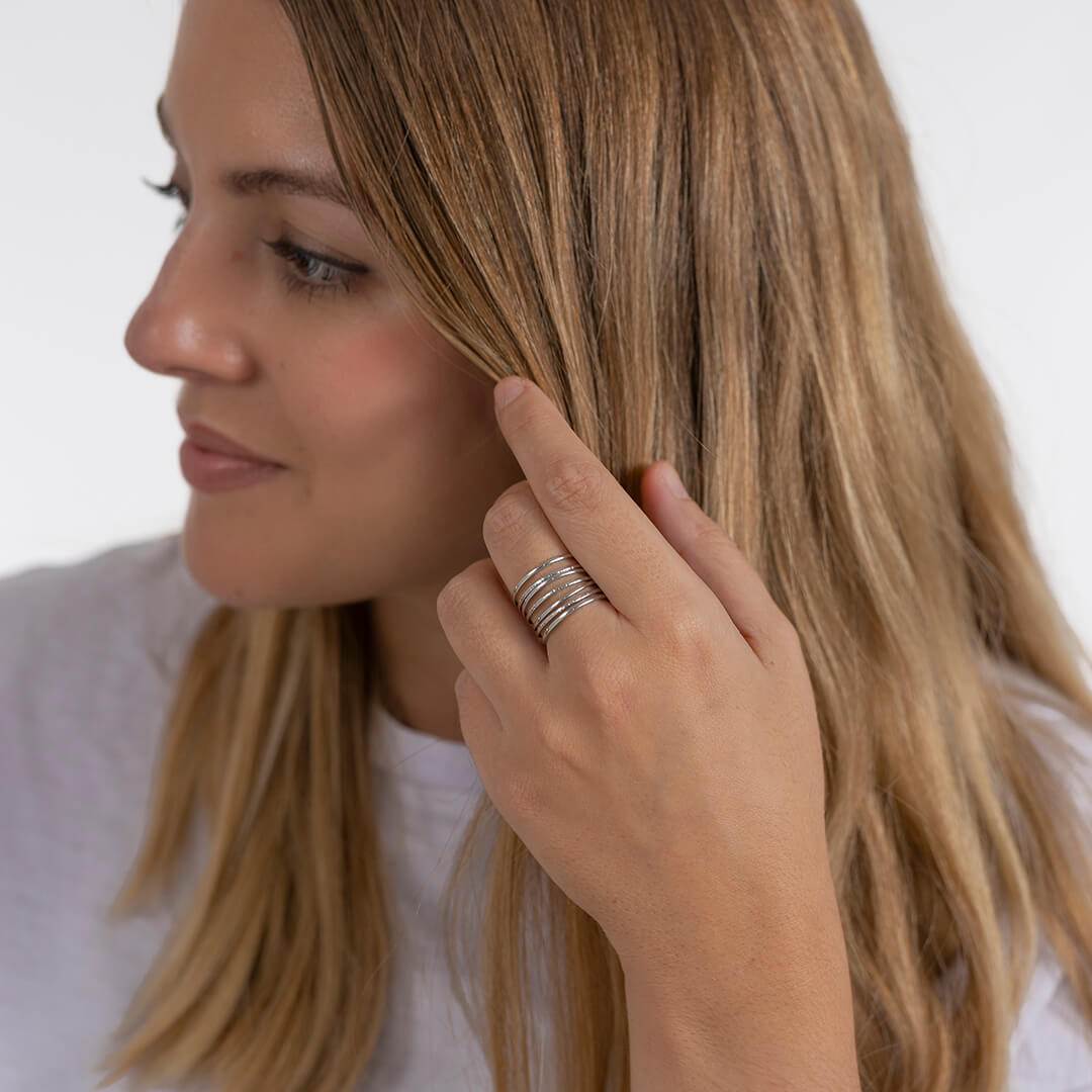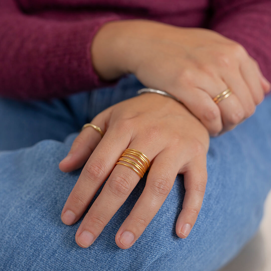 Su diseño limpio y lleno de líneas lo convierte en un anillo muy versátil. Combina genial con looks básicos de diario, vaqueros, camisetas y punto, pero también queda increíble en outfits más arreglados. Y si te encanta hacer mix & match, te chiflará saber que queda de diez con nuestros Brazaletes Bambú. De hecho, es uno de los combos favoritos de nuestra Boss, que lo lleva tanto en dorado como en plata, según el día.