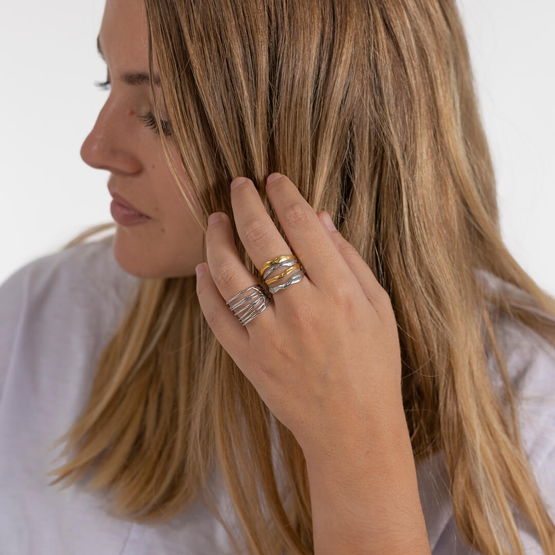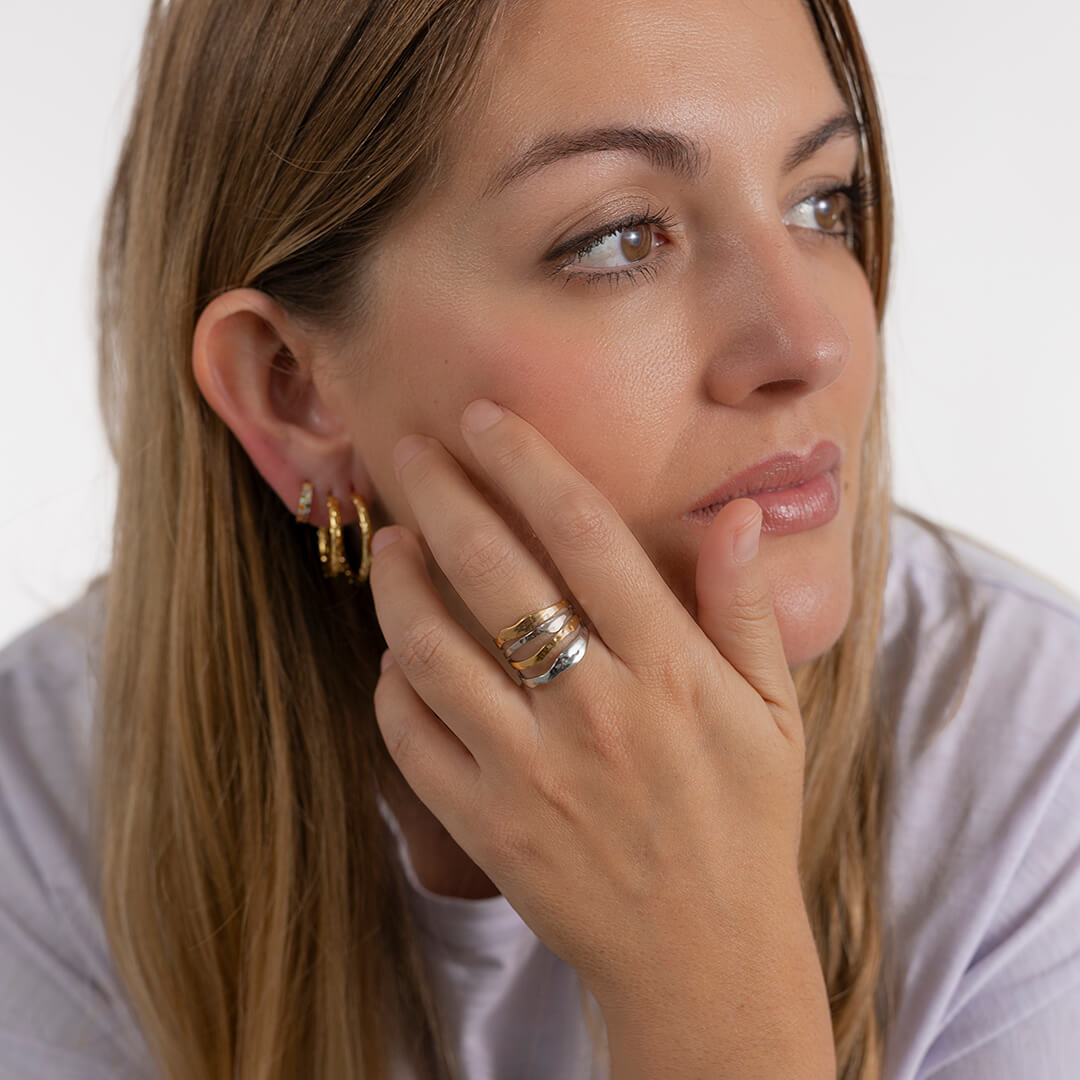 El Anillo Wave es de esas piezas que te pones una vez y ya no te lo quieres quitar. Su diseño de ondas superpuestas, en acabado dorado o bicolor, abraza el dedo con mucho rollo y un punto muy especial, perfecto para las que buscan un anillo diferente pero fácil de combinar en el día a día. Además, está hecho en acero inoxidable, por lo que resiste el trote de tu rutina sin perder brillo: es waterproof, no se estropea con el agua y aguanta perfectamente tu ritmo entre duchas, lavados de manos y planes non-stop.
