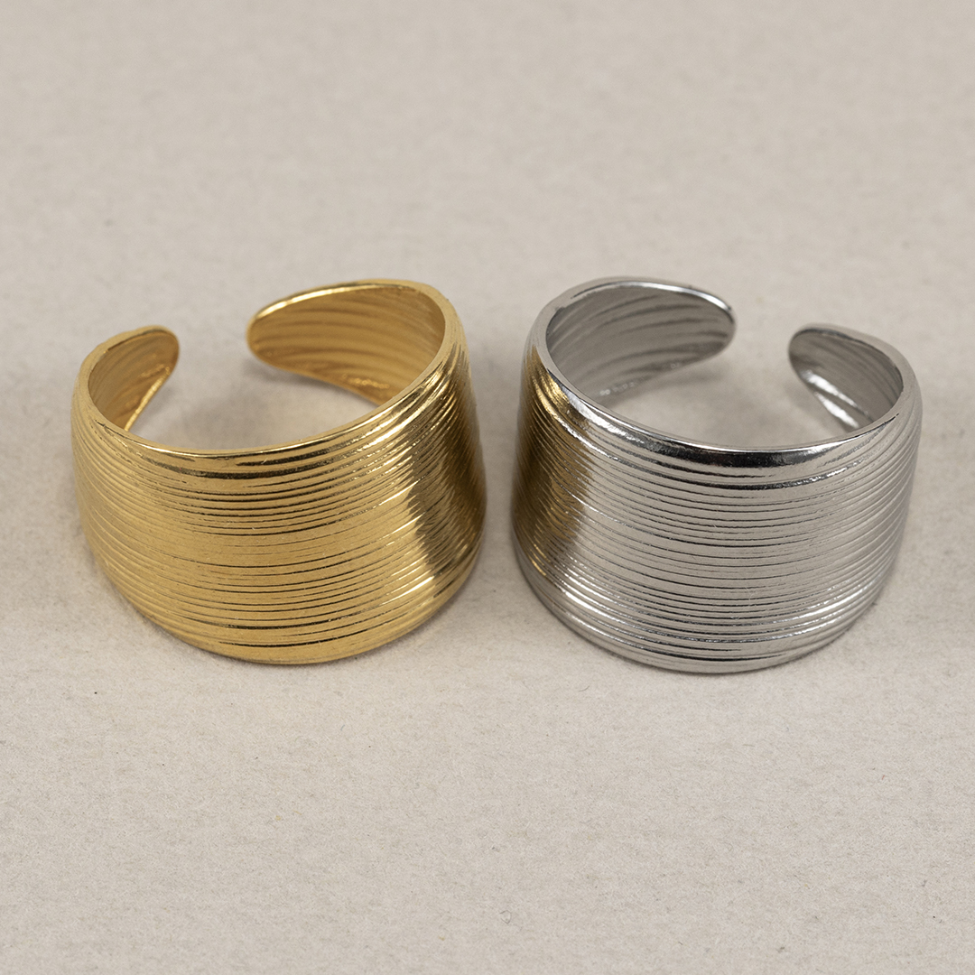El Anillo Duna es un anillo ancho de acero inoxidable, ajustable e hipoalergénico. Ligero, cómodo y súper versátil: llévalo en cualquier dedo y combínalo con tus anillos favoritos.