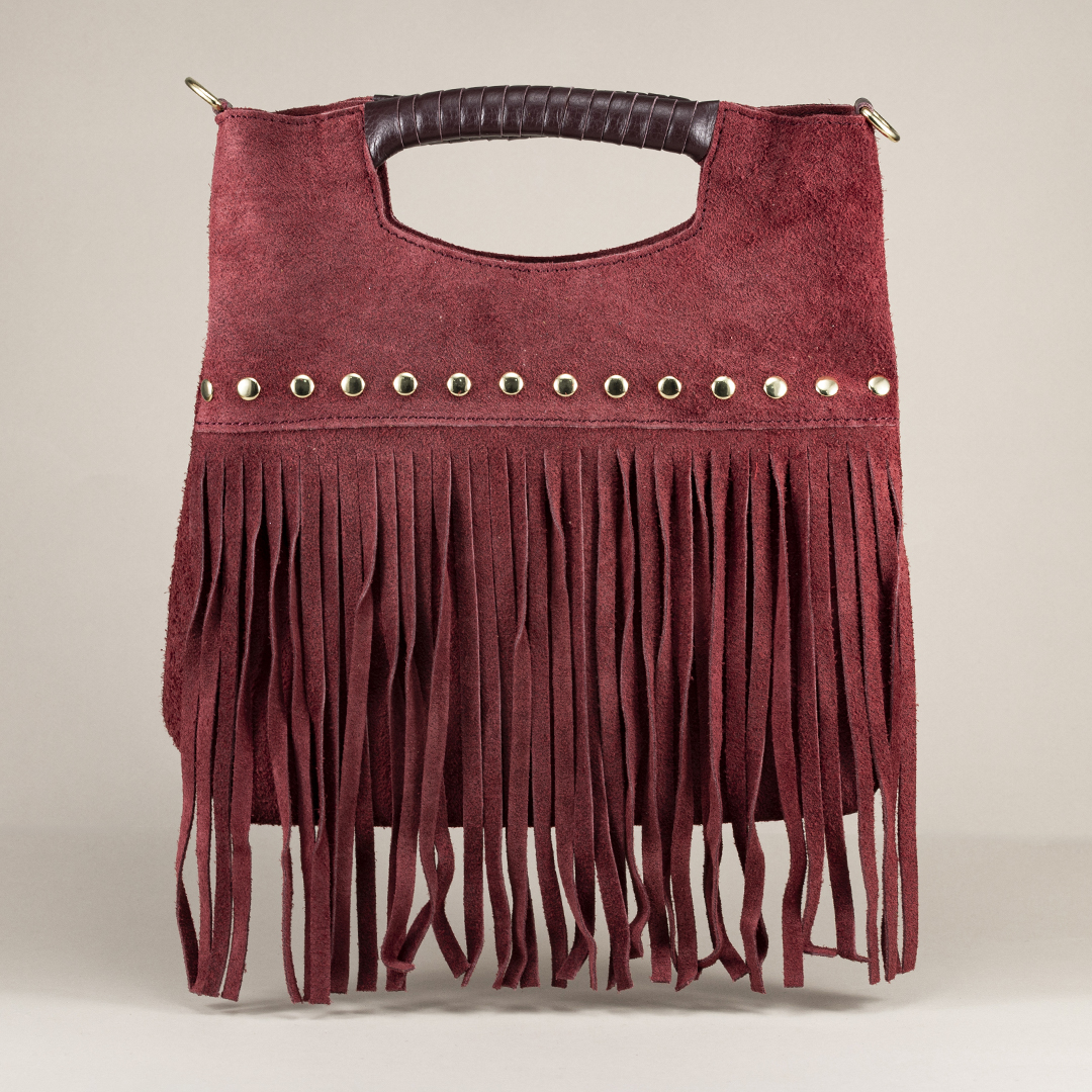 Bolso flecos burdeos en piel italiana con tachuelas. Con asa de mano y bandolera. Un básico boho para elevar cualquier look.