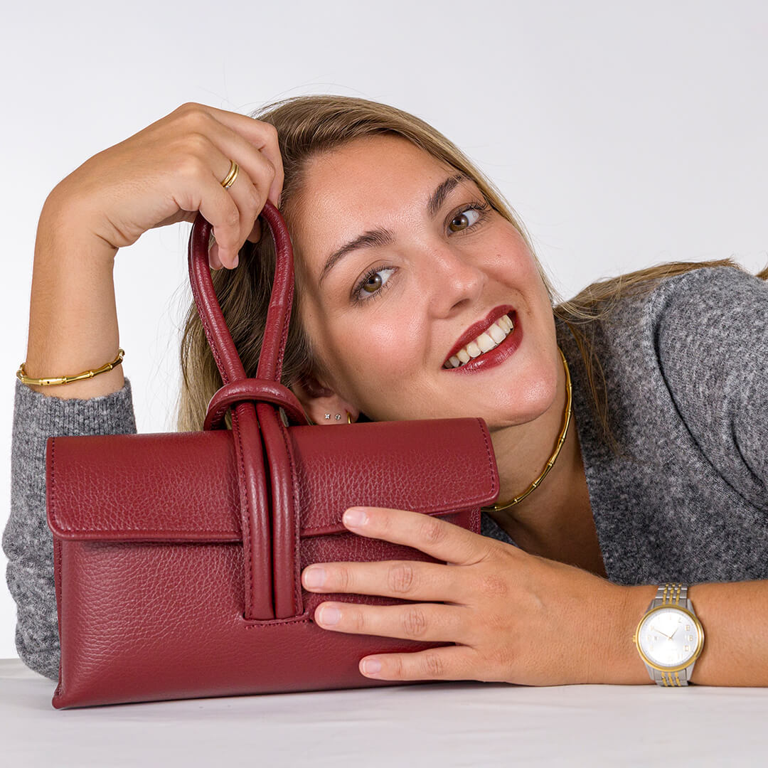 Descubre el bolso de piel Andrius en burdeos: versátil, elegante y cómodo, con doble asa. Ideal para looks diarios o eventos especiales.