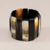Brazalete Eclipse, de la Colección Duality. Tallado a mano en cuerno natural de búfalo con vetas en tonos miel, marfil y negro. Hecho en Italia. Es elástico, ajustable y muy cómodo. Su diseño ancho y elegante refleja la armonía entre la luz y la sombra.