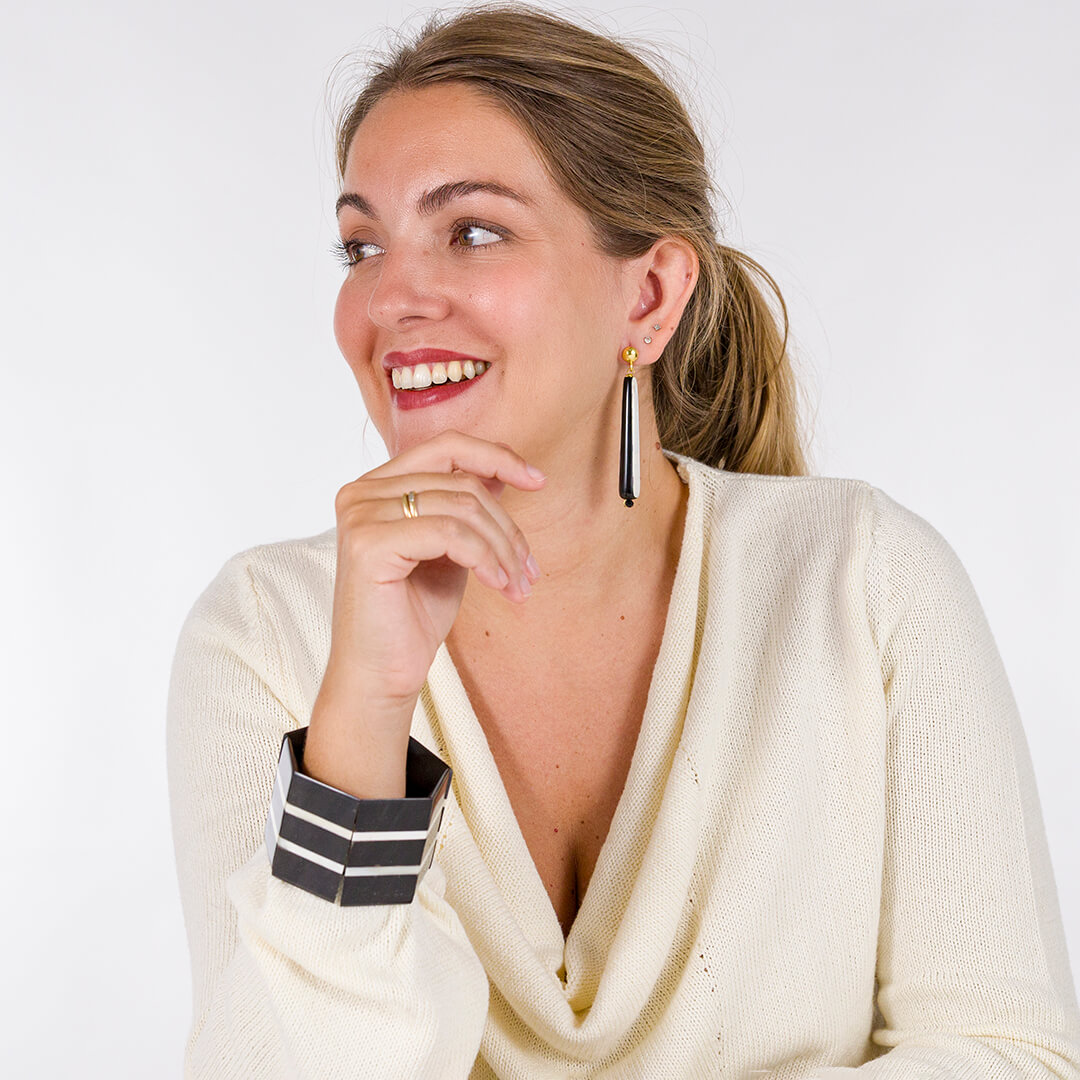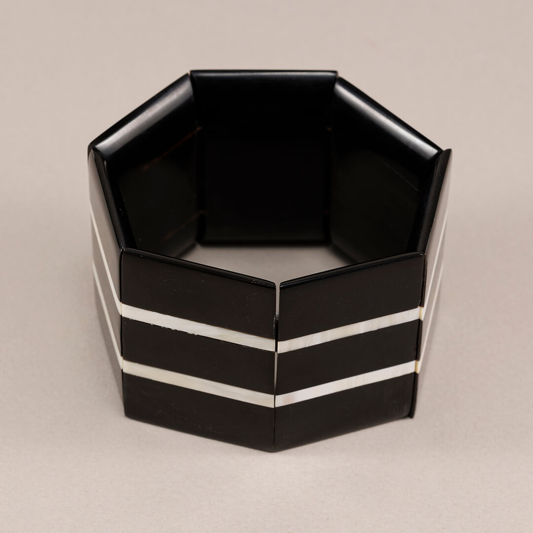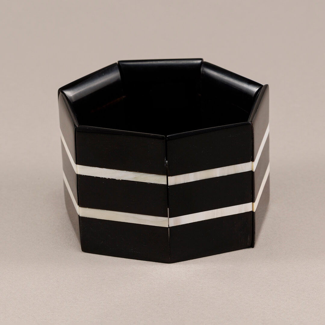 Brazalete Nébula, de la Colección Duality. Hecho en Italia y tallado a mano en cuerno natural de búfalo. Su diseño geométrico en blanco y negro lo convierte en una pieza moderna, elegante y atemporal. Es elástico, ajustable y muy cómodo de llevar.
