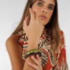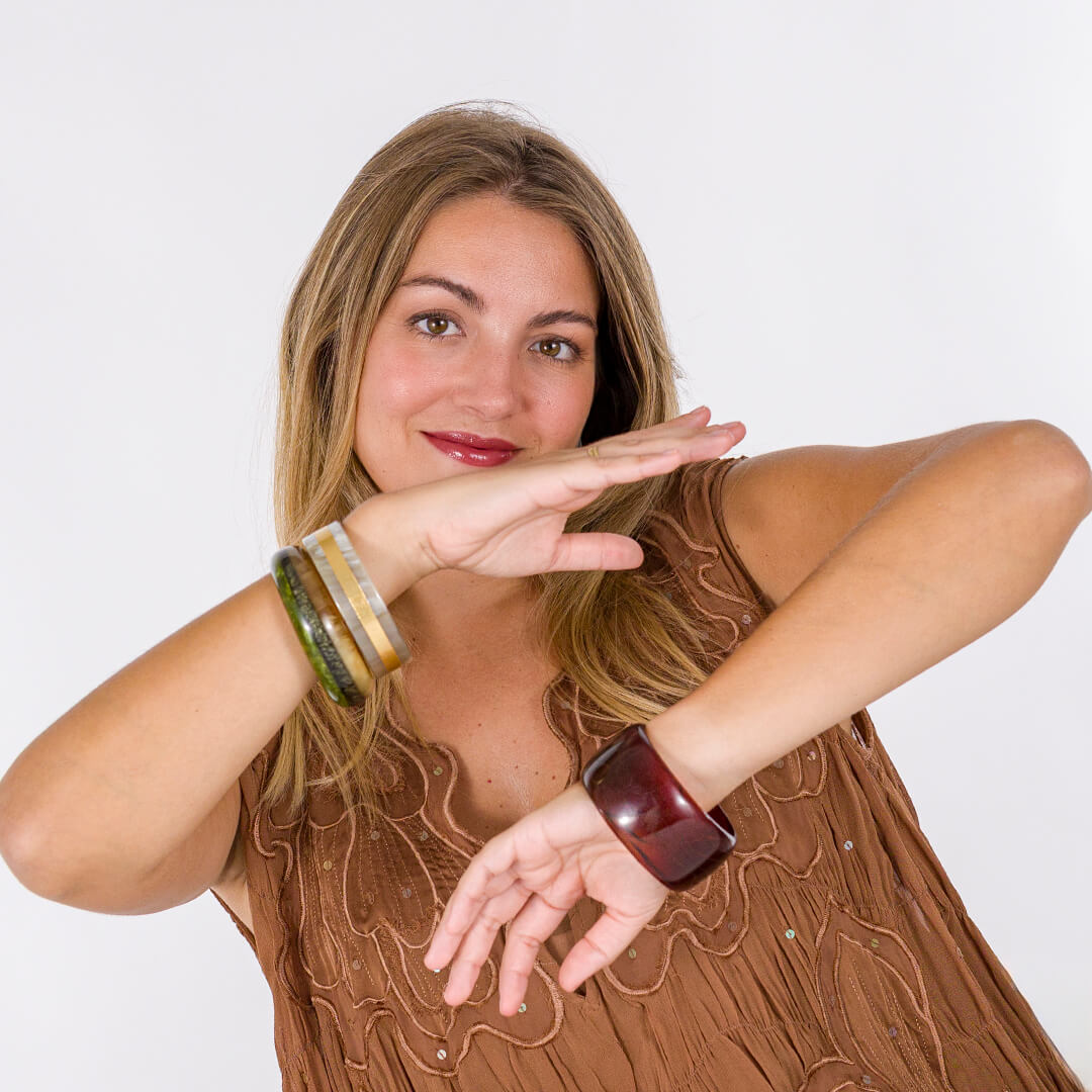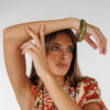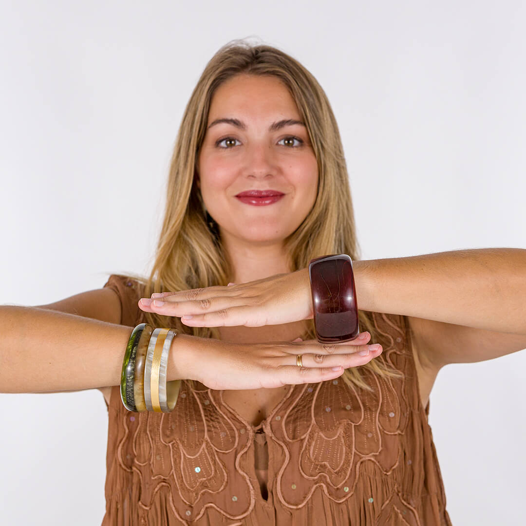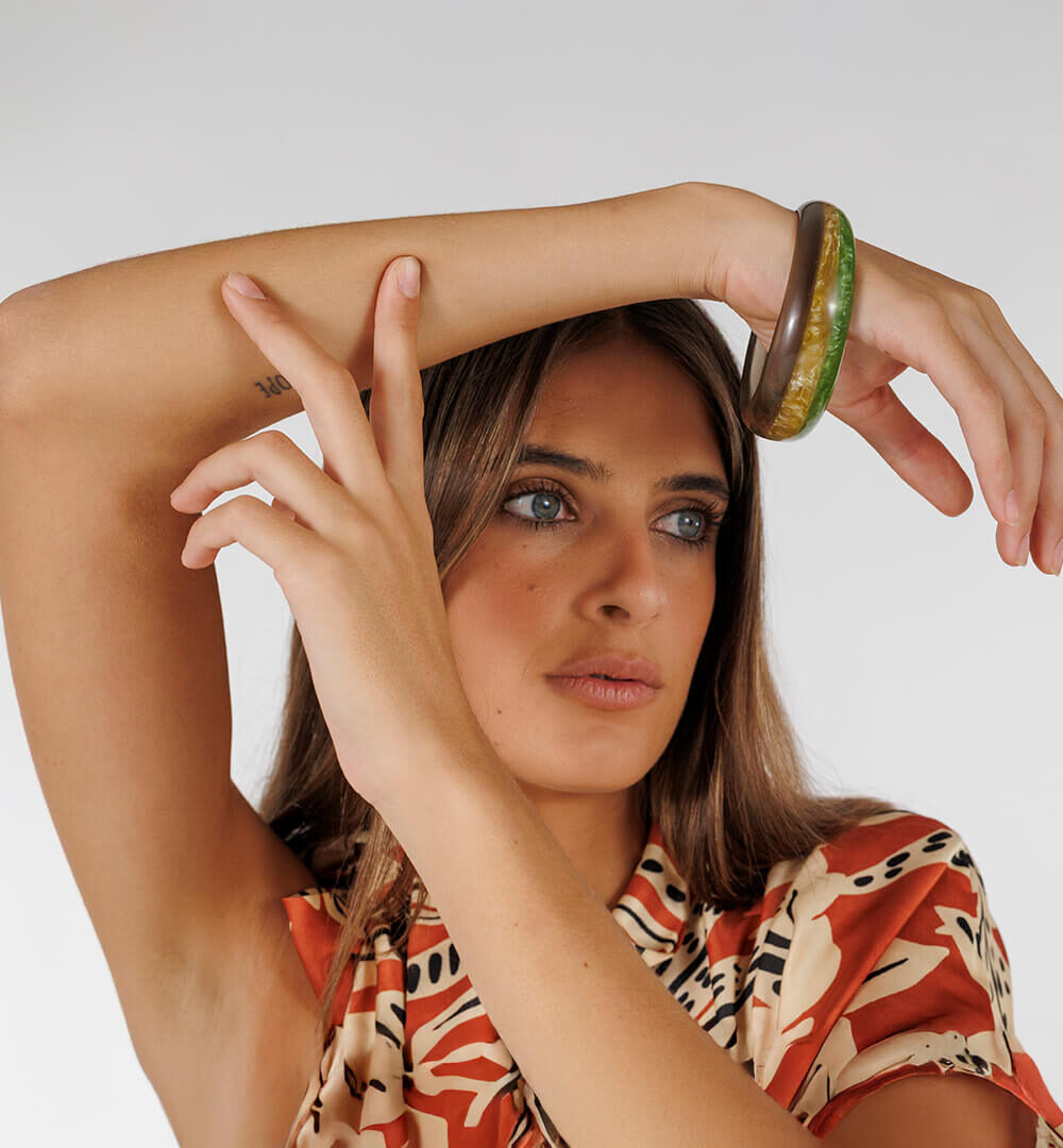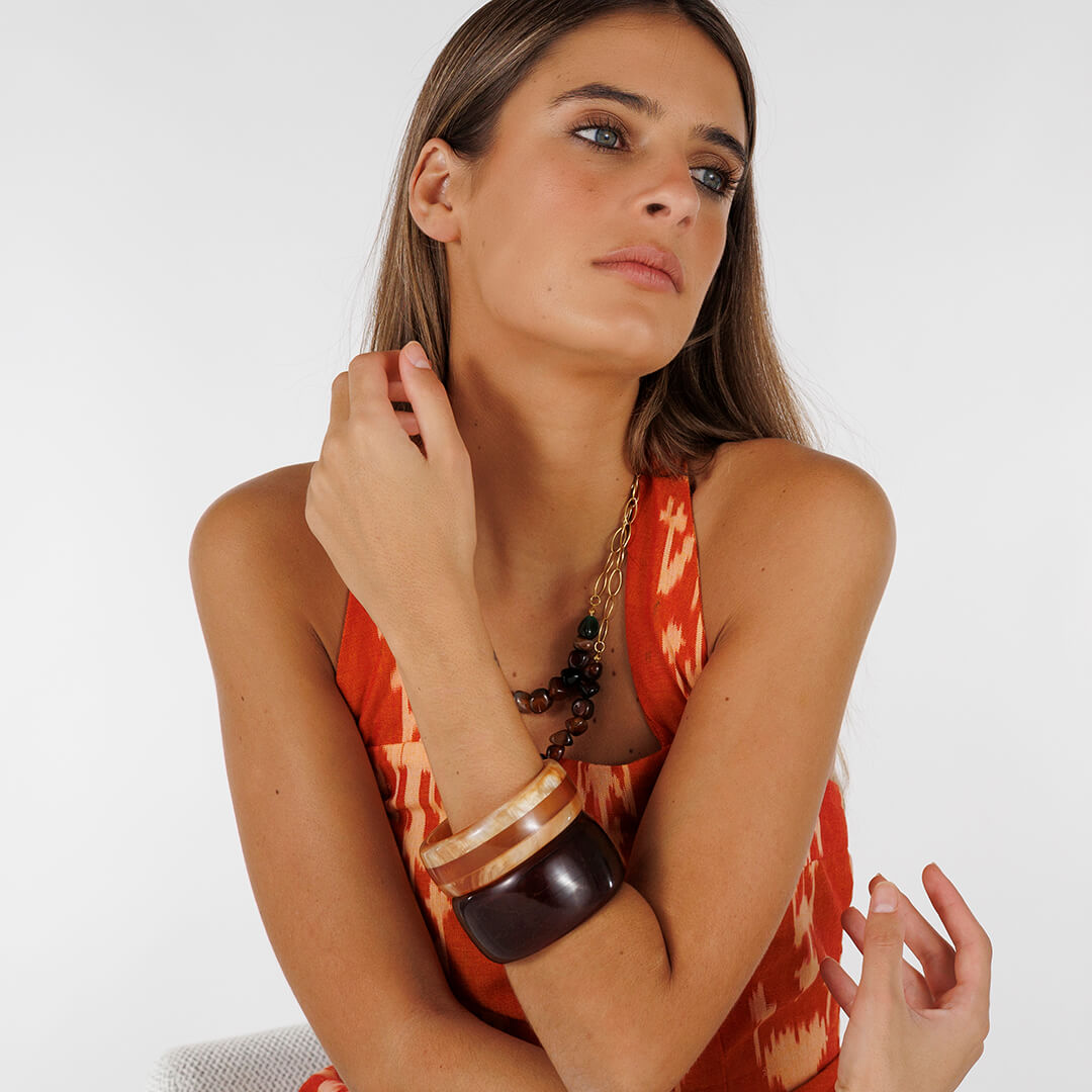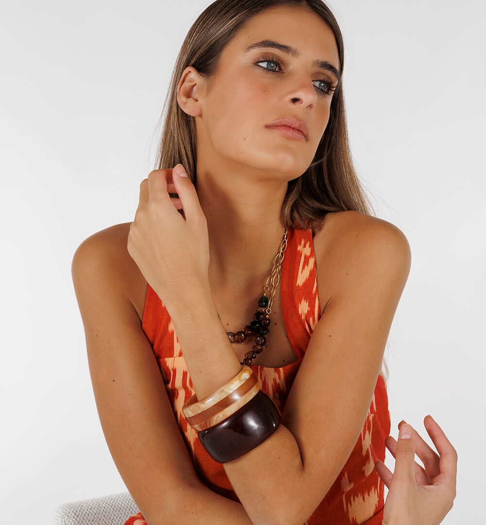El Brazalete Lagos está hecho a mano con cuerno de búfalo natural, lo que convierte cada pieza en una joya única. Disponible en dos combinaciones —verde y marrón o miel y dorado—, destaca por su brillo y vetas naturales que reflejan la artesanía africana. Pertenece a una colección cápsula artesanal donde cada detalle se cuida al máximo. Es un brazalete versátil y elegante, perfecto tanto para un look de invitada como para outfits más casuales.