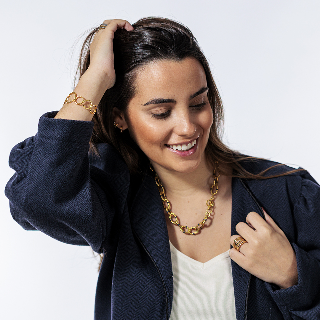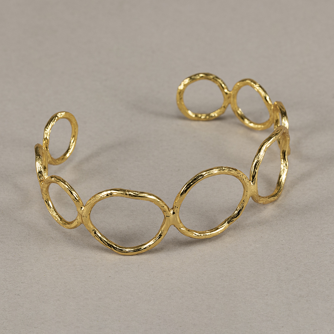 Está elaborado en bronce con baño de oro de 18k, con un acabado brillante que resalta cada uno de sus detalles. Su diseño de aros irregulares y abiertos crea un efecto ligero y dinámico en la muñeca, aportando estilo sin resultar excesivo. Es un brazalete rígido, cómodo y muy fácil de llevar, perfecto tanto para el día a día como para ocasiones más especiales.