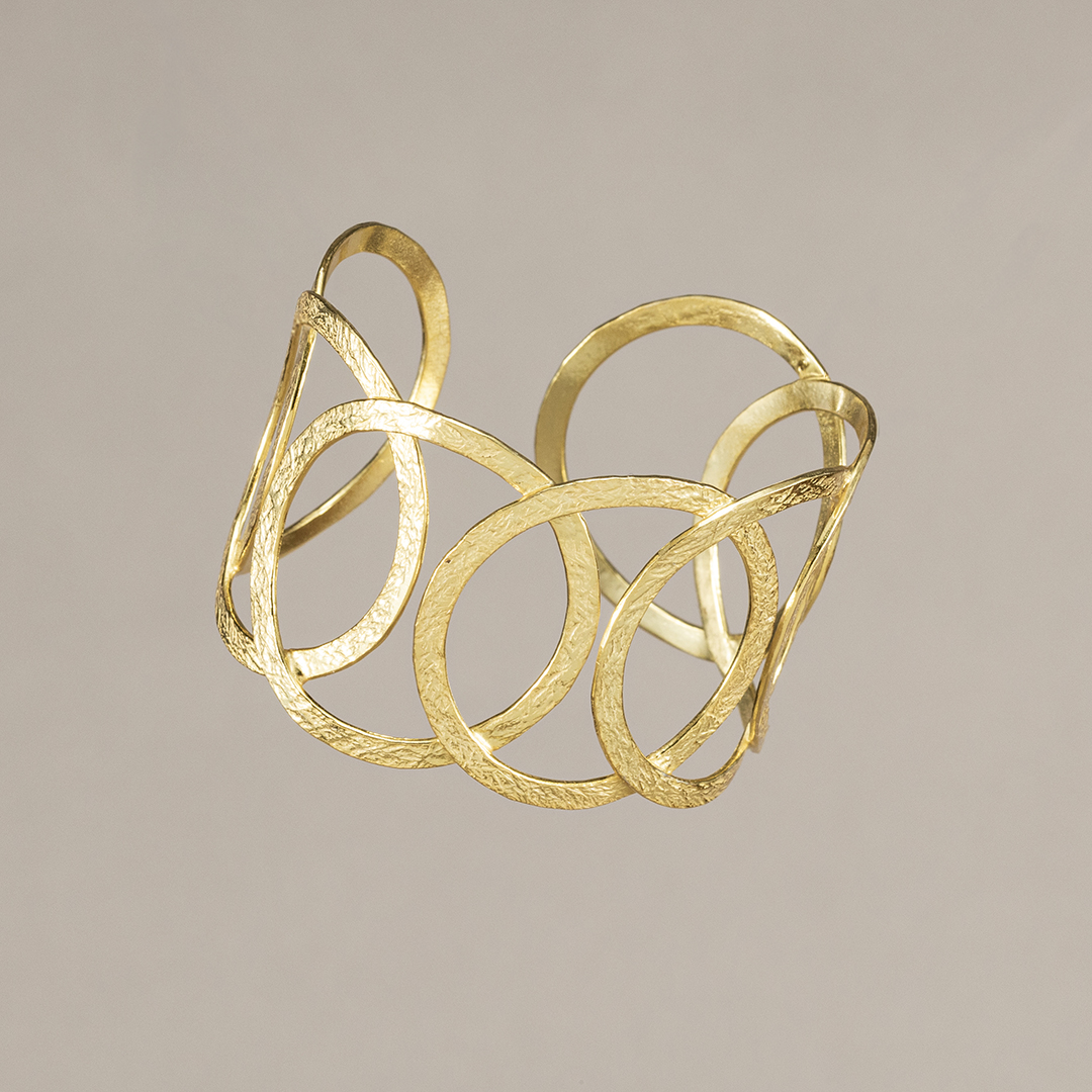 Está elaborado en bronce con baño de oro de 18k, con un acabado ligeramente texturizado que le aporta un brillo elegante, nada plano. Su diseño de aros entrelazados tipo nudo crea un efecto visual súper favorecedor en la muñeca, aportando volumen sin resultar pesado. Es una pulsera rígida, cómoda de llevar y perfecta para quienes buscan una pieza protagonista sin complicaciones.