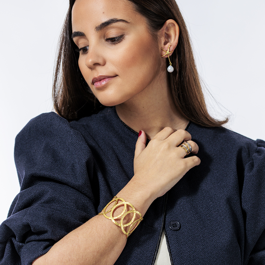 Brazalete rígido de bronce con baño de oro de 18k y diseño de aros tipo nudo. Una pieza elegante y versátil que transforma cualquier look.