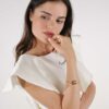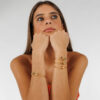 Lo mejor es que puedes elegir entre dos acabados diferentes: con la piedra en forma ovalada o redonda, según tu estilo. Todo el brazalete está martillado a mano, lo que le da unos destellos increíbles cuando le da la luz. Esa textura artesanal lo convierte en una joya boho chic, perfecta para llevar sola o combinada con otras pulseras, como hace nuestra modelo con el Brazalete oro Tetuán. ¡Un look boho total que está pegando fuerte esta temporada!