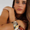 Su diseño ancho, elástico y completamente ajustable hace que resulte cómodo, ligero y muy fácil de llevar. A pesar de su tamaño, no pesa, se adapta a la muñeca con suavidad y aporta un toque de estilo lleno de carácter. Es el accesorio perfecto para elevar un look sencillo, prendas lisas, tejidos naturales o cualquier conjunto con tonos cálidos.