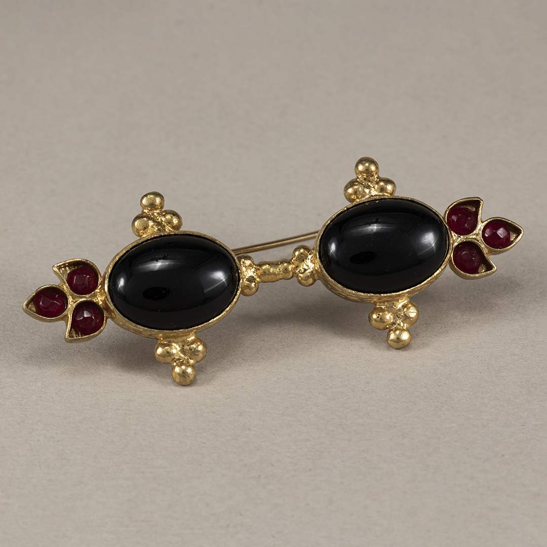 A ambos lados del broche aparecen pequeñas piedras de granate, conocidas por su color rojo profundo y por simbolizar la energía, la pasión y la vitalidad. La combinación entre el negro del ónix, el rojo del granate y el dorado del broche crea un contraste muy elegante que hace que esta pieza resulte especialmente llamativa.