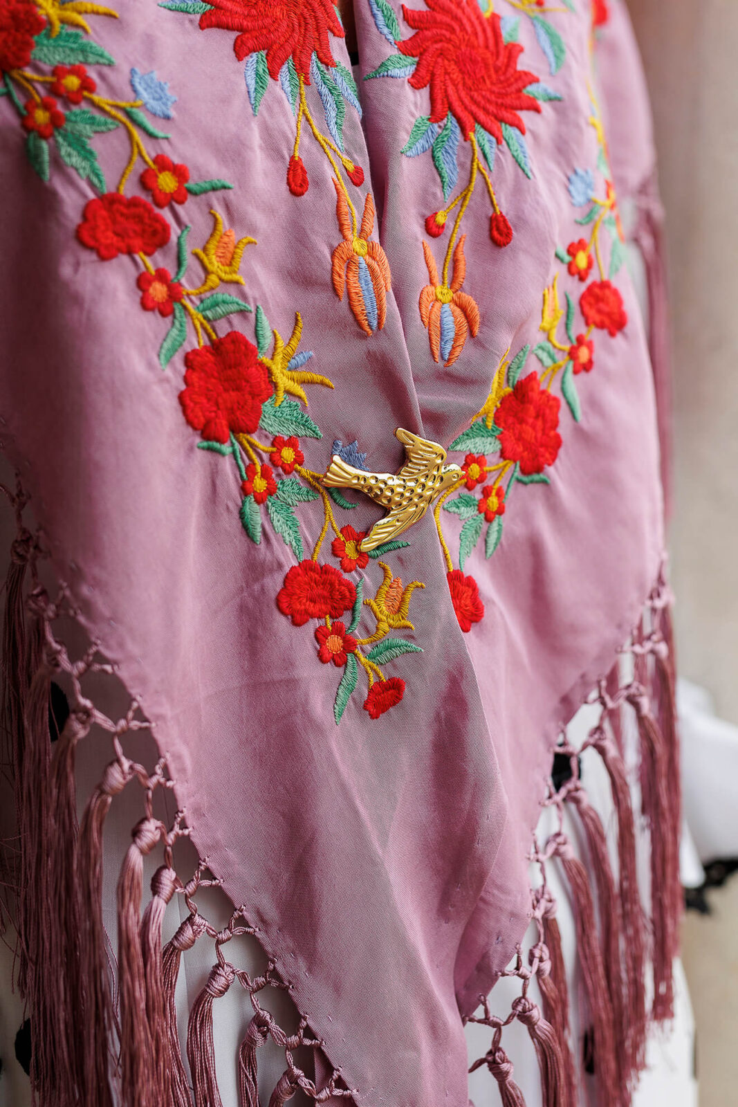 Nos encanta especialmente cómo queda con nuestros trajes de flamenca, sujetando el mantón con fuerza y aportando ese toque dorado que ilumina el conjunto. Pero también es ideal para invitadas, eventos especiales o incluso para elevar un look básico del día a día.
