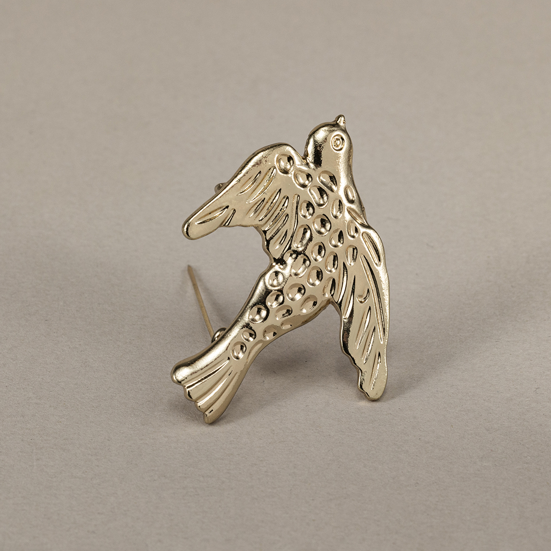 Broche en forma de golondrina fabricado en metal dorado. Elegante, ligero y perfecto para sujetar mantoncillos o dar un toque especial a cualquier look.