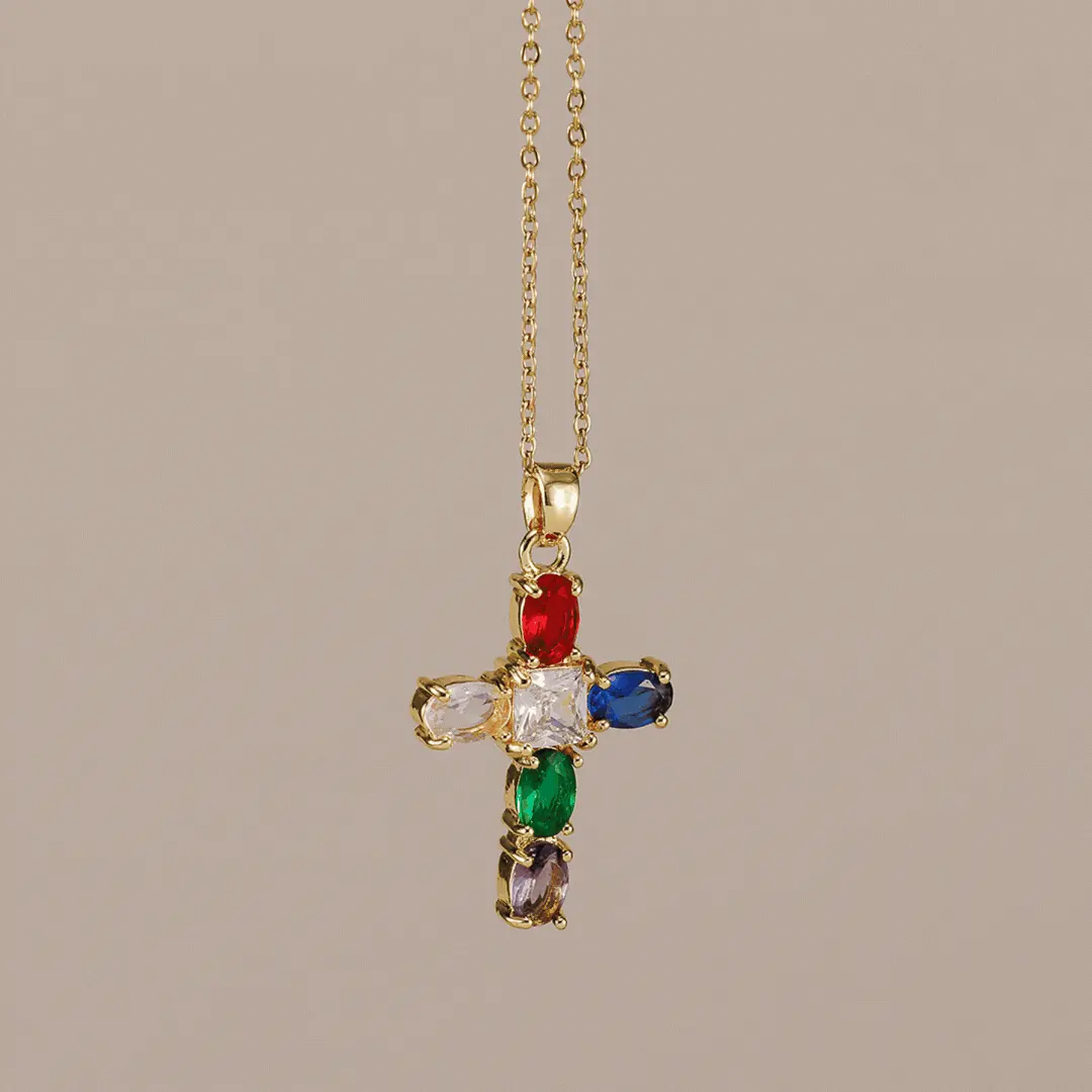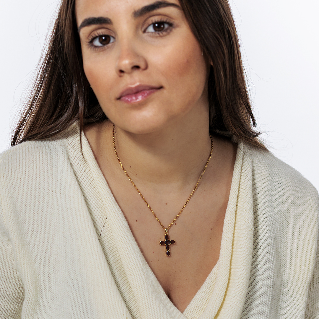 Cadena con cruz de circonitas montada en acero inoxidable dorado, waterproof e hipoalergénica. Disponible en tres versiones: multicolor, malva y negro. Perfecta para llevar sola o combinar en layering