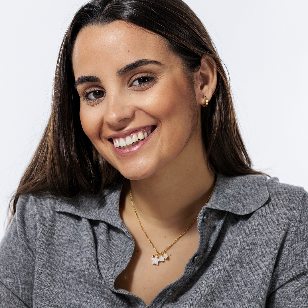 Esta cadena está formada por eslabones pequeños en acero inoxidable dorado, delicados y resistentes a partes iguales. Es waterproof e hipoalergénica, perfecta para llevarla todos los días sin preocuparte por nada. En el centro cuelga una estrella grande de nácar que representa a la mamá. Su brillo natural es sutil y elegante, y lleva una pequeña piedra facetada en color rosa que aporta ese toque especial y femenino que nos encanta.