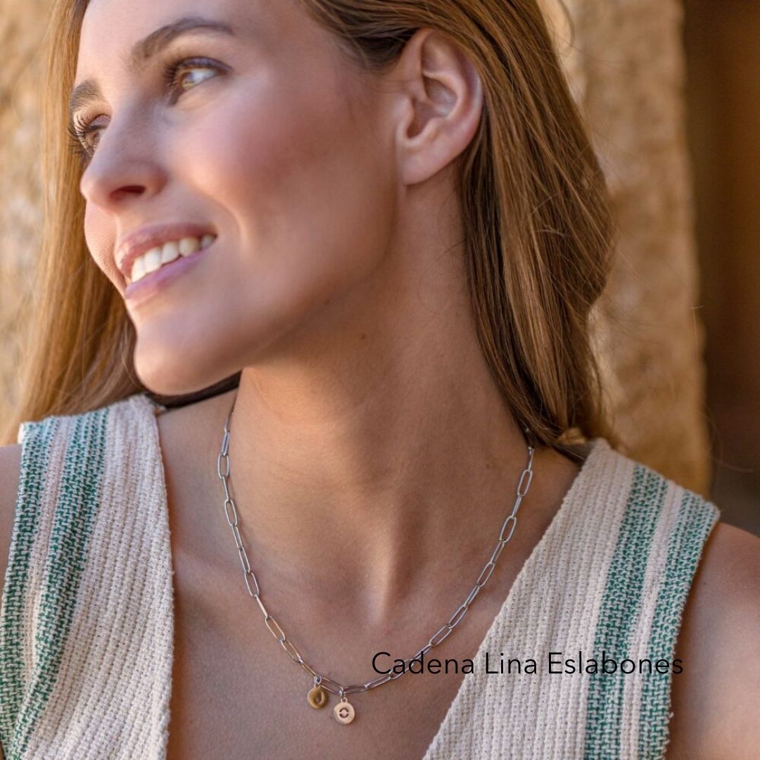 Para personalizarla, primero eliges la cadena que más te guste entre nuestros cuatro modelos básicos: Caribe, Pilar, Lina o Briana. Cada cadena aporta una personalidad diferente: desde eslabones más protagonistas hasta opciones más finitas y delicadas. Después seleccionas tus dos letras y creas tu combinación única.
