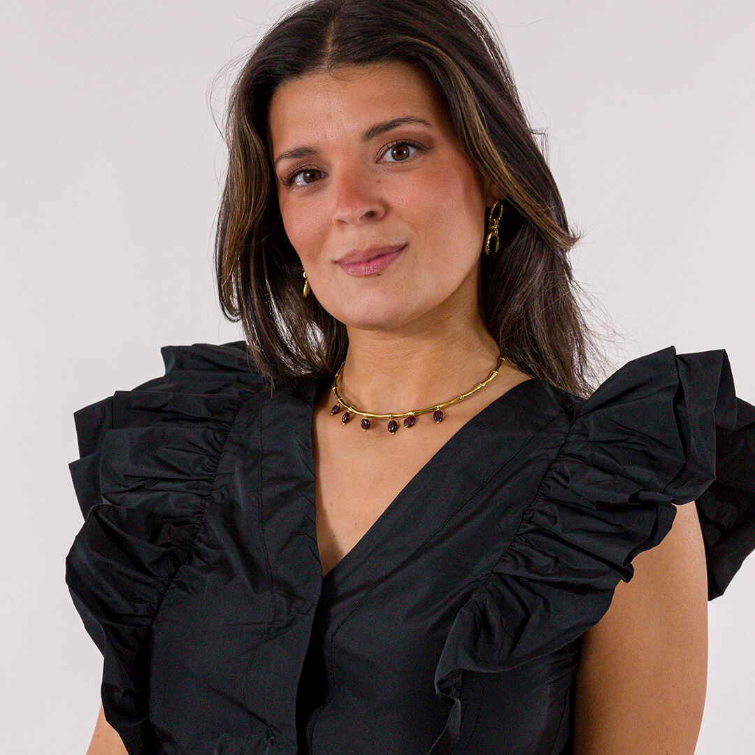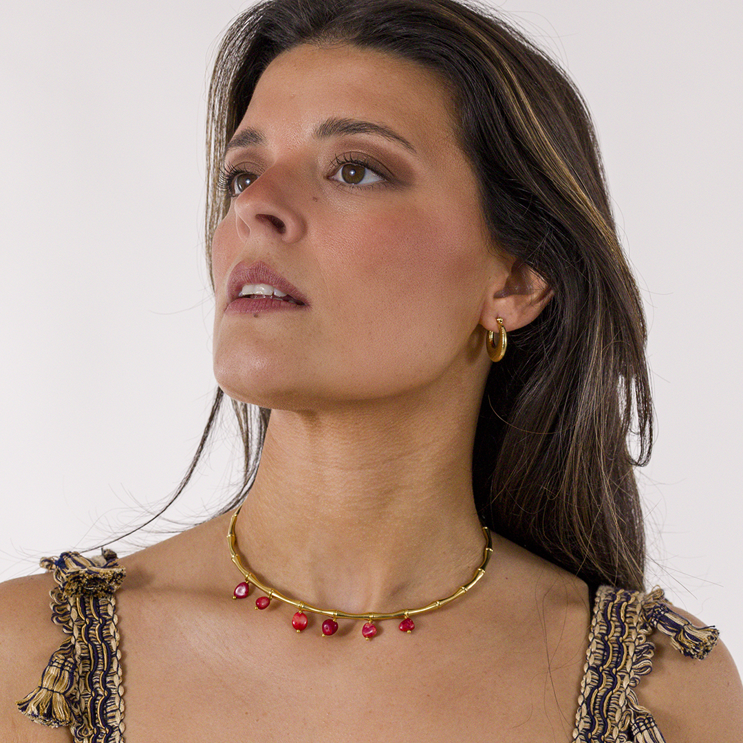 El Choker Bambú es una cadena rígida dorada que descansa en las clavículas con pequeñas piedras naturales de coral rojo, verde amazonita, blanco con perla de río, granate con ágata y negro con obsidiana.