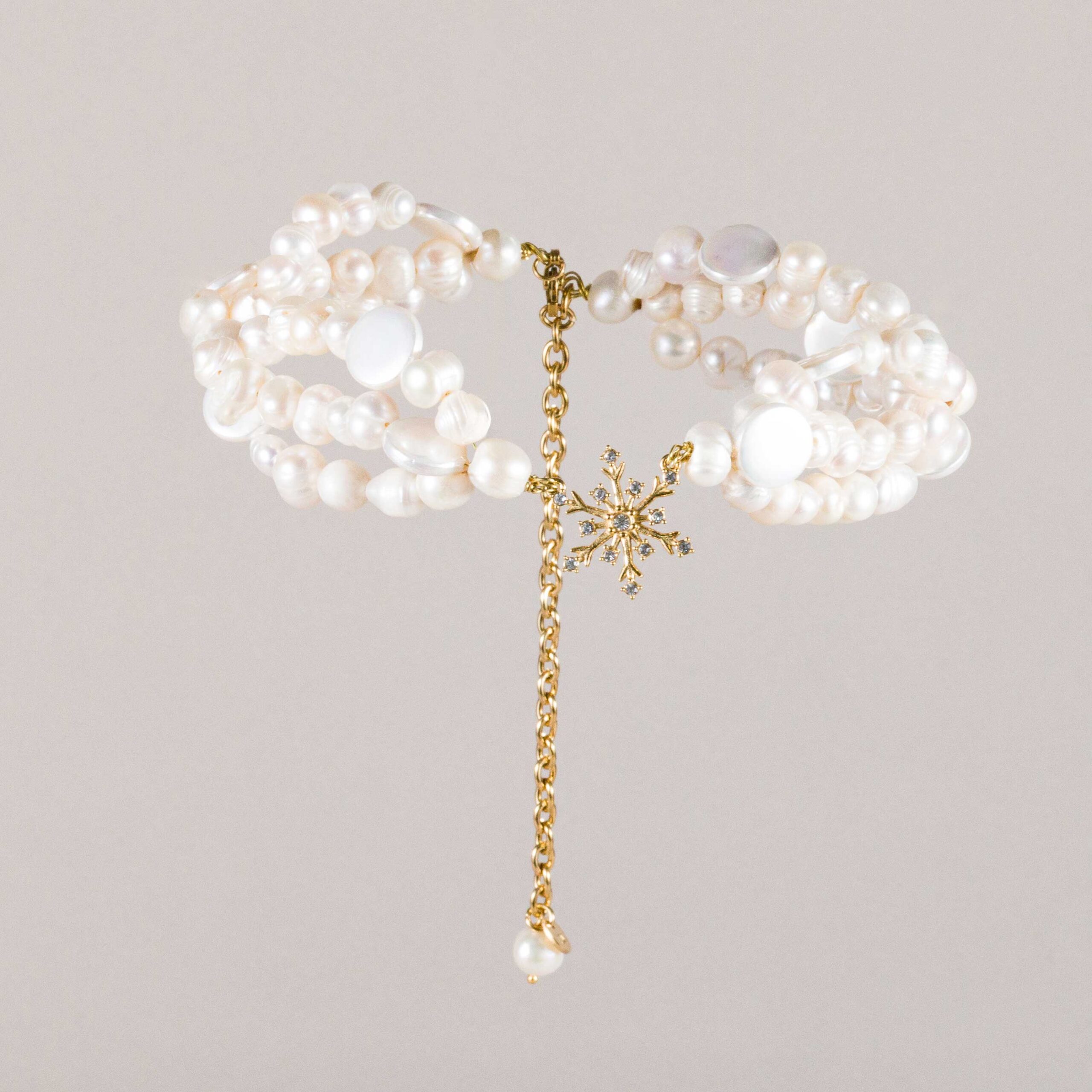 Este diseño lleva en medio una estrella de acero inoxidable decorado con circonitas blancas .Del centro salen tres líneas de perlas de agua cultivadas en color blanco de diferentes tamaños y formas. Estas tres líneas se van cruzando entre sí creando una mezcla muy bella.