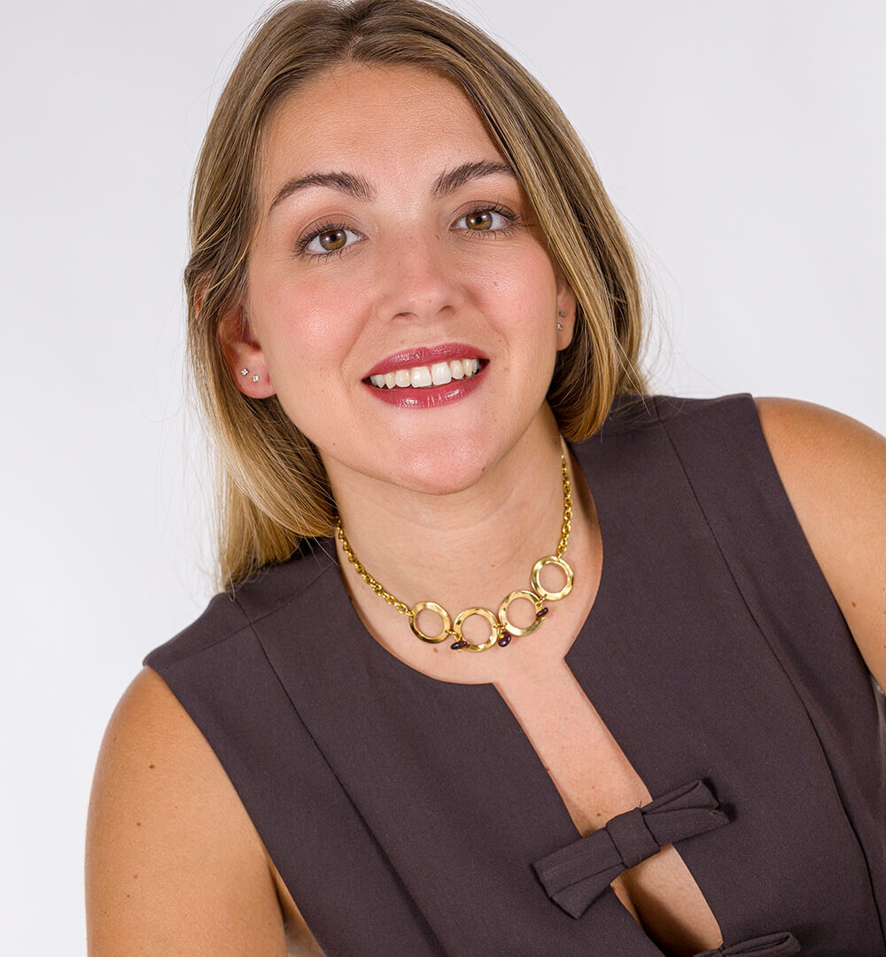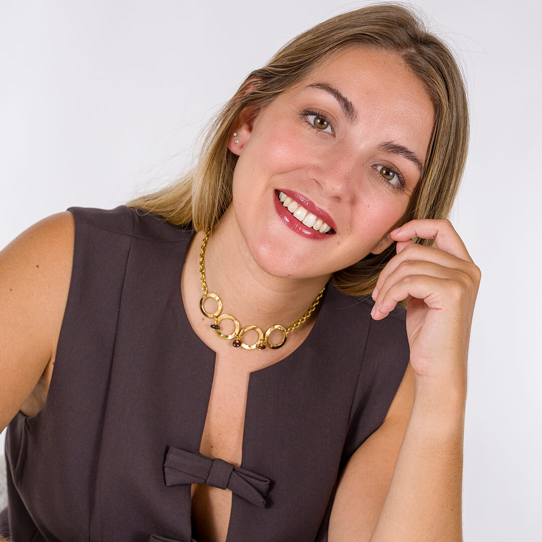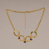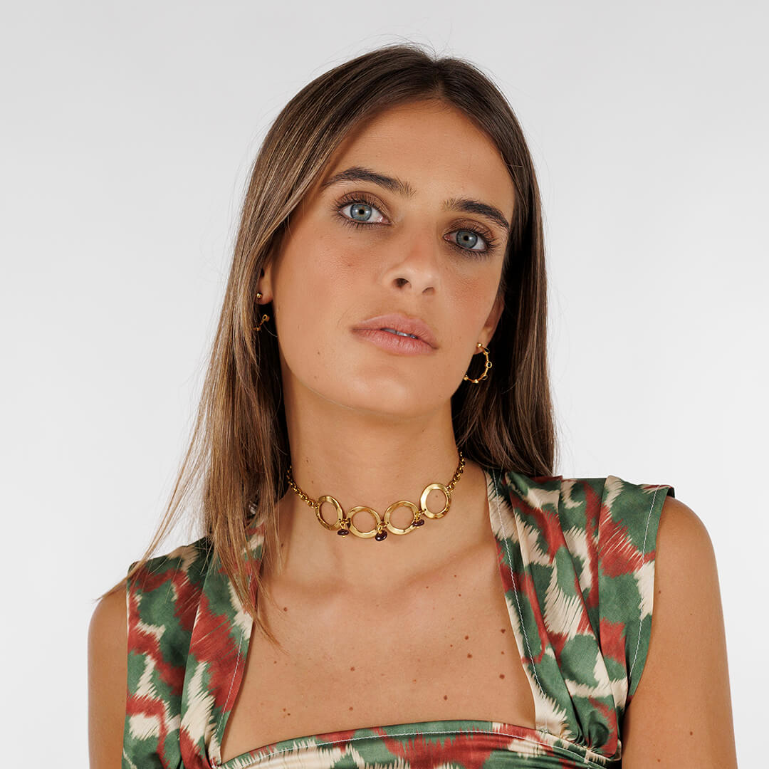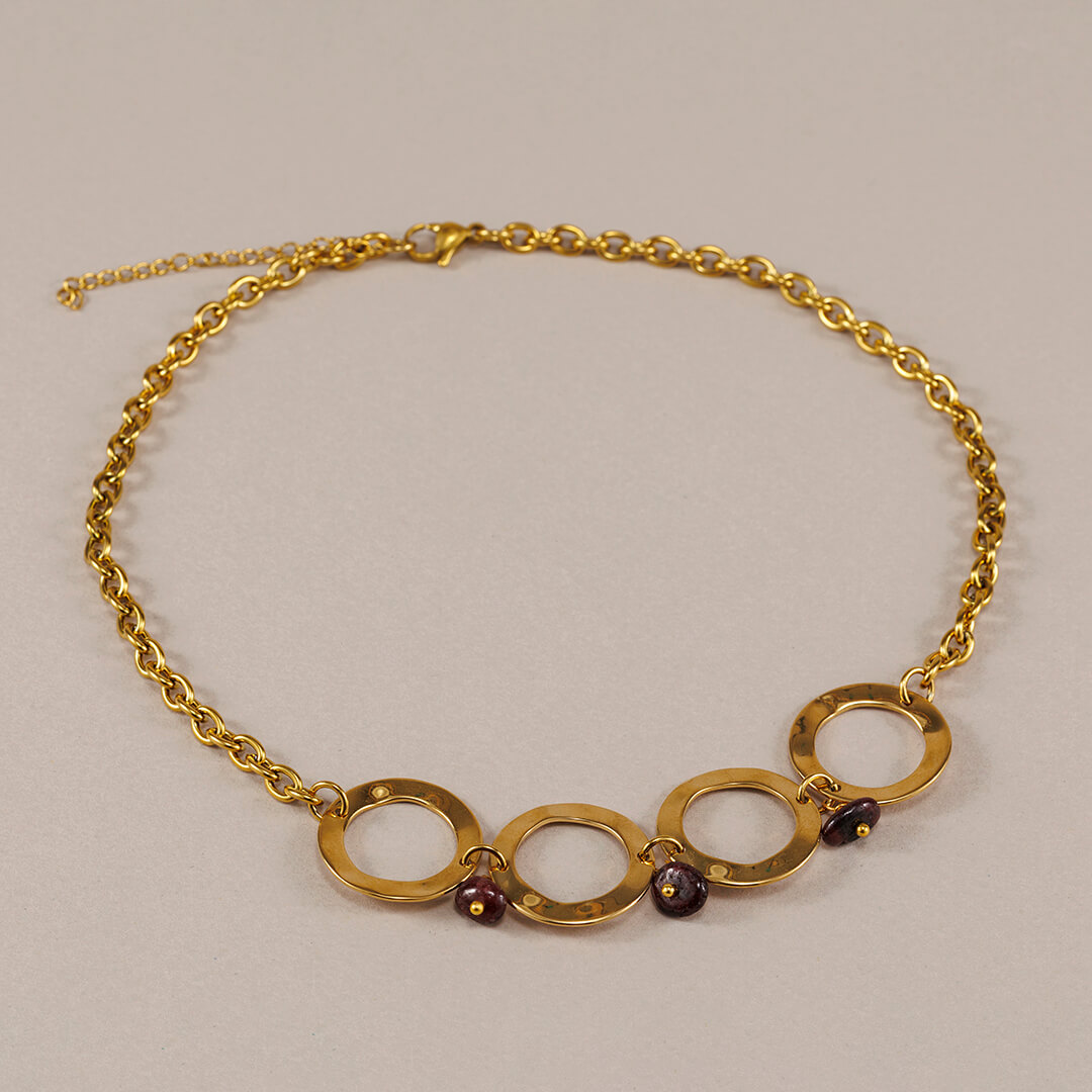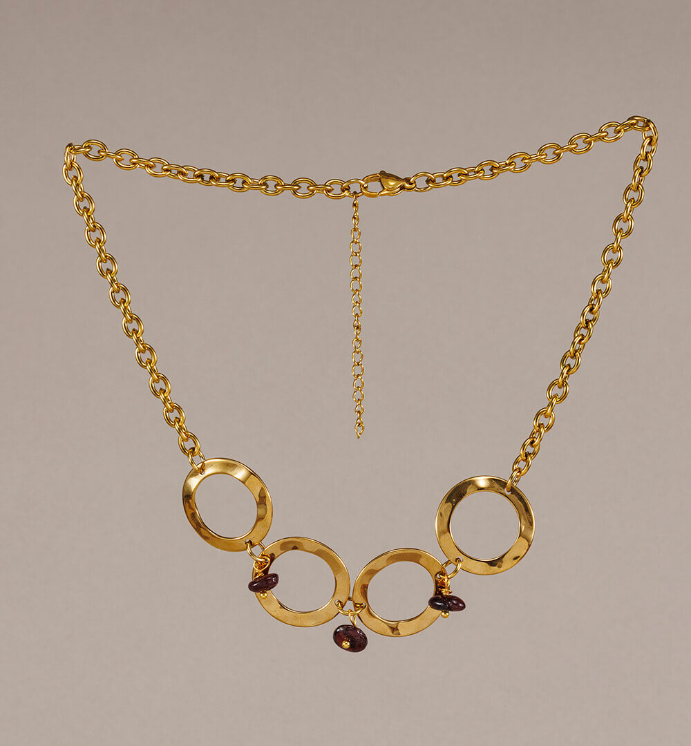 El diseño combina una cadena de eslabones dorados con cuatro aros centrales y pequeñas piedras naturales de ágata en color granate. Cada piedra es única, lo que hace que cada pieza también lo sea. El ágata es conocida por sus propiedades energéticas: se dice que aporta equilibrio emocional, serenidad y protección. Además, el tono granate está muy presente esta temporada, aportando calidez y un toque elegante a cualquier look.