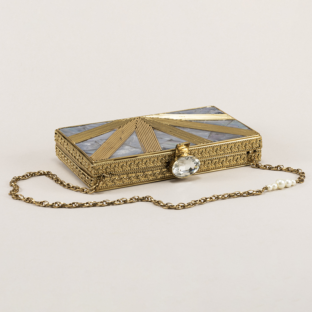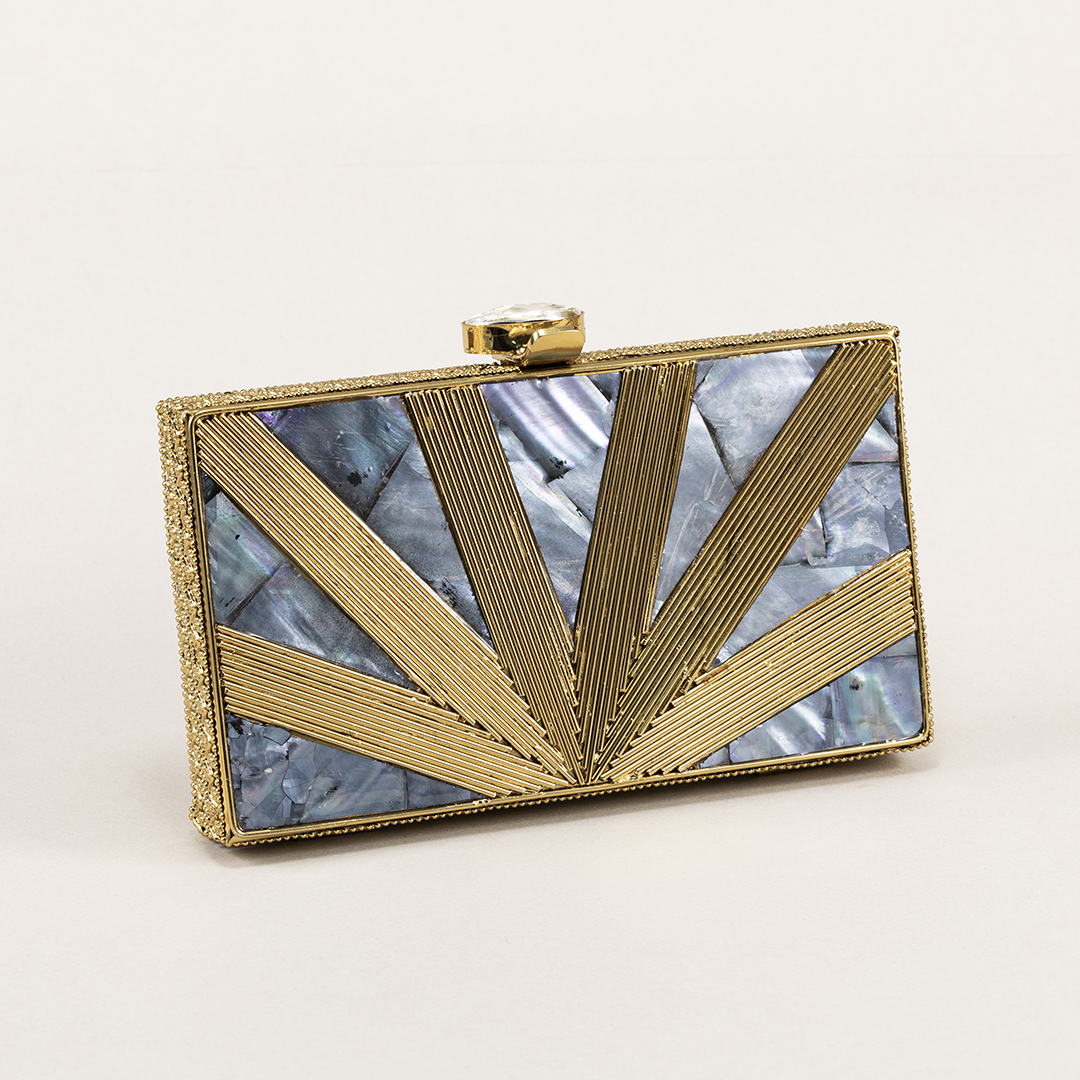 Clutch Luxury Shadow, bolso joya en latón dorado y nácar oscuro con diseño geométrico en relieve. Elegante, estructurado y con cierre imantado, incluye cadena para llevarlo colgado. El complemento perfecto para invitadas que quieren marcar la diferencia.