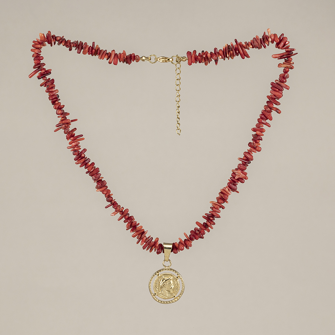 Collar Coral Rojo con Medalla Moneda Clásica