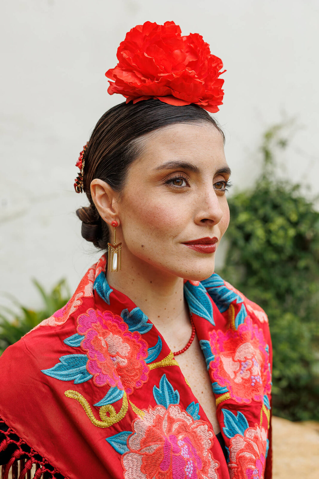Su color rojo intenso aporta luz al rostro y combina con todo. Es el típico collar que puedes llevar en tu día a día con una camisa blanca, un vestido sencillo o incluso con un look más relajado. Pero si hay un momento donde realmente brilla es en un estilismo flamenco. No hace falta decir lo espectacular que queda con un traje de flamenca, aportando ese toque tradicional que nunca falla.