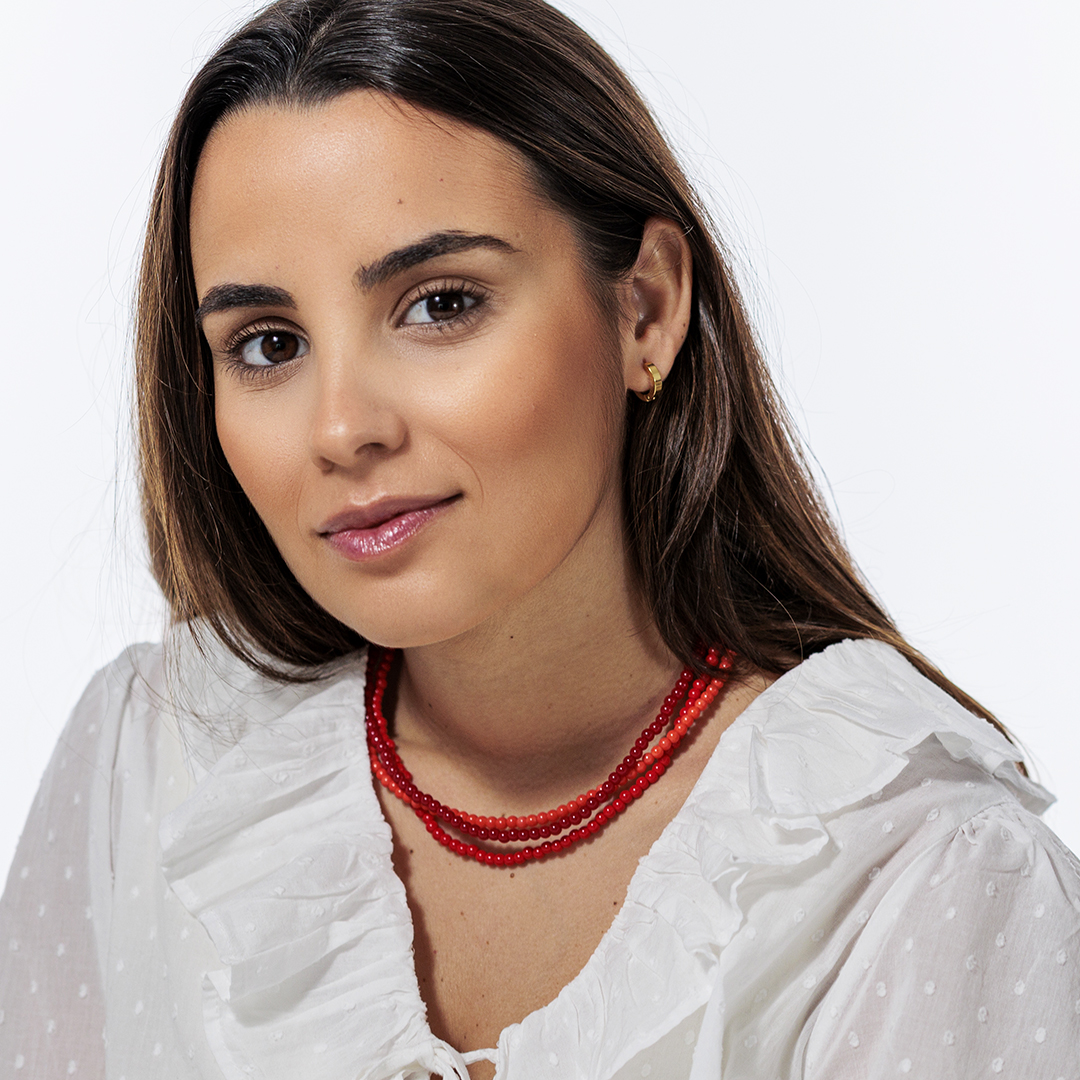 Son tonos con muchísima fuerza y personalidad, pensados para llenar de luz tus looks esta primavera-verano. El naranja aporta energía y frescura, el rojo es pura pasión y el granate es elegante y profundo. Tres colores que favorecen muchísimo y que puedes llevar solos o combinados entre sí, como hace nuestra modelo María en la foto, que lleva los tres collares superpuestos… y no nos puede gustar más el resultado.