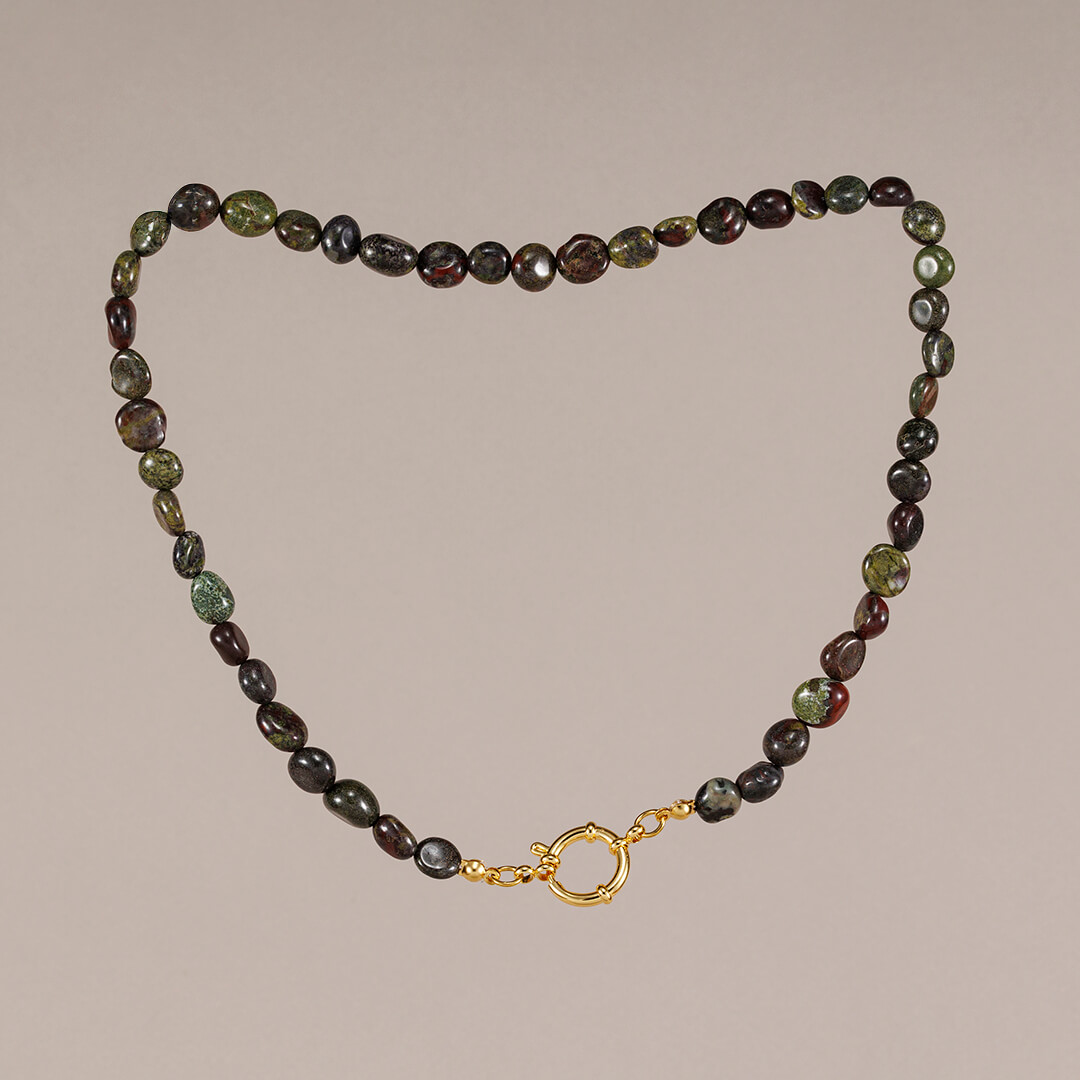 Cada collar es único, ya que las vetas y tonalidades del jaspe varían de forma natural entre verdes oscuros, granates y marrones profundos, creando un efecto visual elegante y lleno de carácter.
