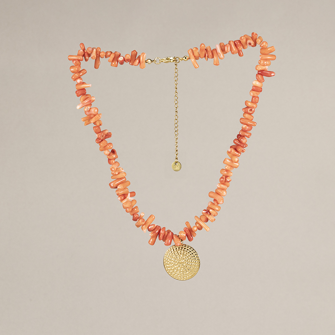 ¡Ya huele a verano en Darwin y no podíamos esperar más para enseñarte esta maravilla! El Collar Mumbai es pura fantasía. Es un collar de piedras naturales montado a mano en nuestro taller de Sevilla, con mucho cariño y detalle. Está repleto de corales naturales y tiene como protagonista un medallón dorado amartillado.