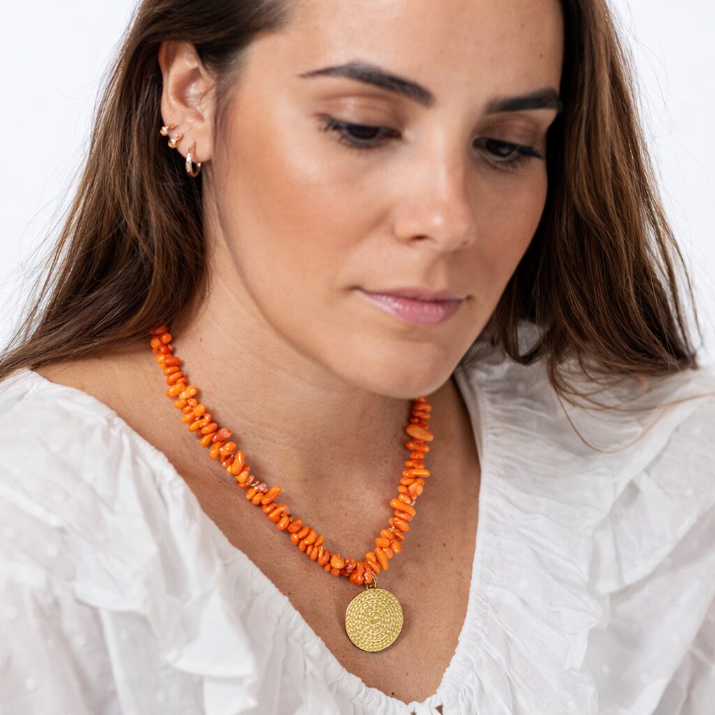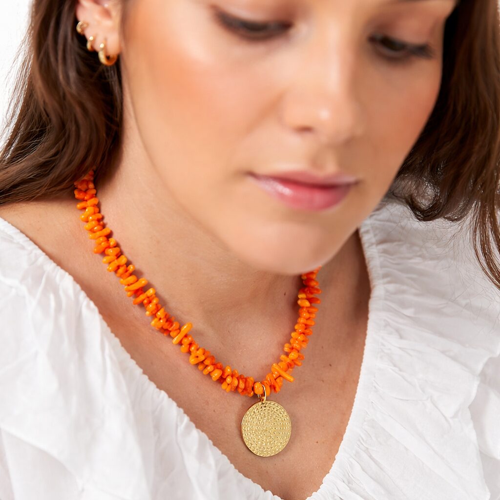 El Collar Mumbai es pura magia artesanal. Montado a mano en nuestro taller con corales naturales naranjas y un medallón central dorado amartillado. Hecho en acero inoxidable, es waterproof, hipoalergénico y perfecto para cualquier look veraniego. ¡Ideal para brillar en verano 2026!