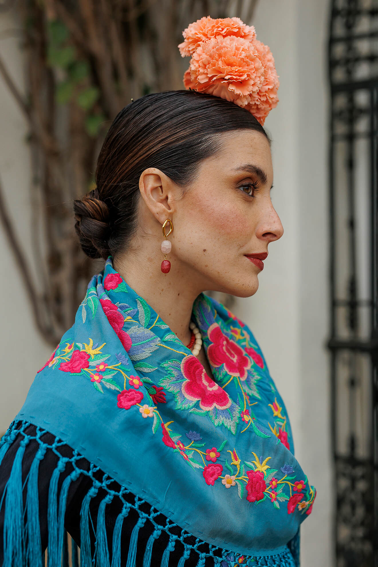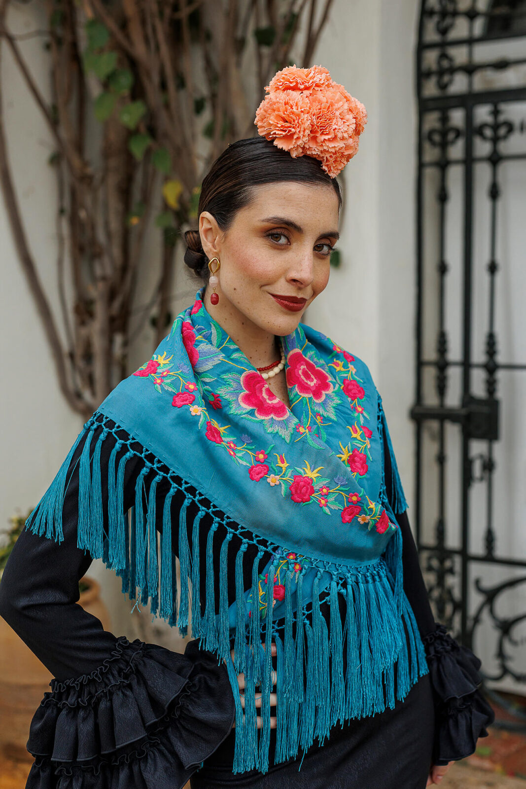 El look se completa con un ramillete de claveles en color salmón, un tono que conecta perfectamente con uno de los colores presentes en los bordados del mantoncillo.