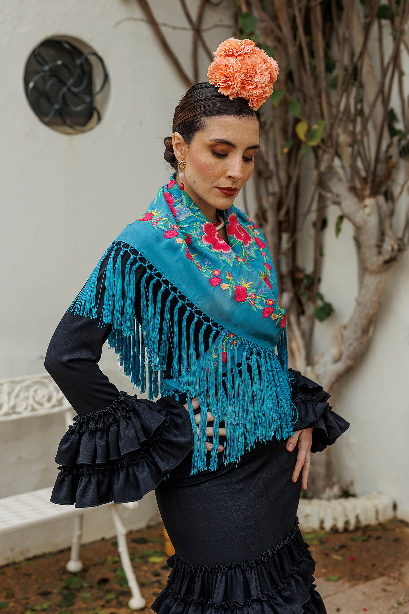 Look flamenca azul turquesa Darwin 2 – mantoncillo, pendientes y flor