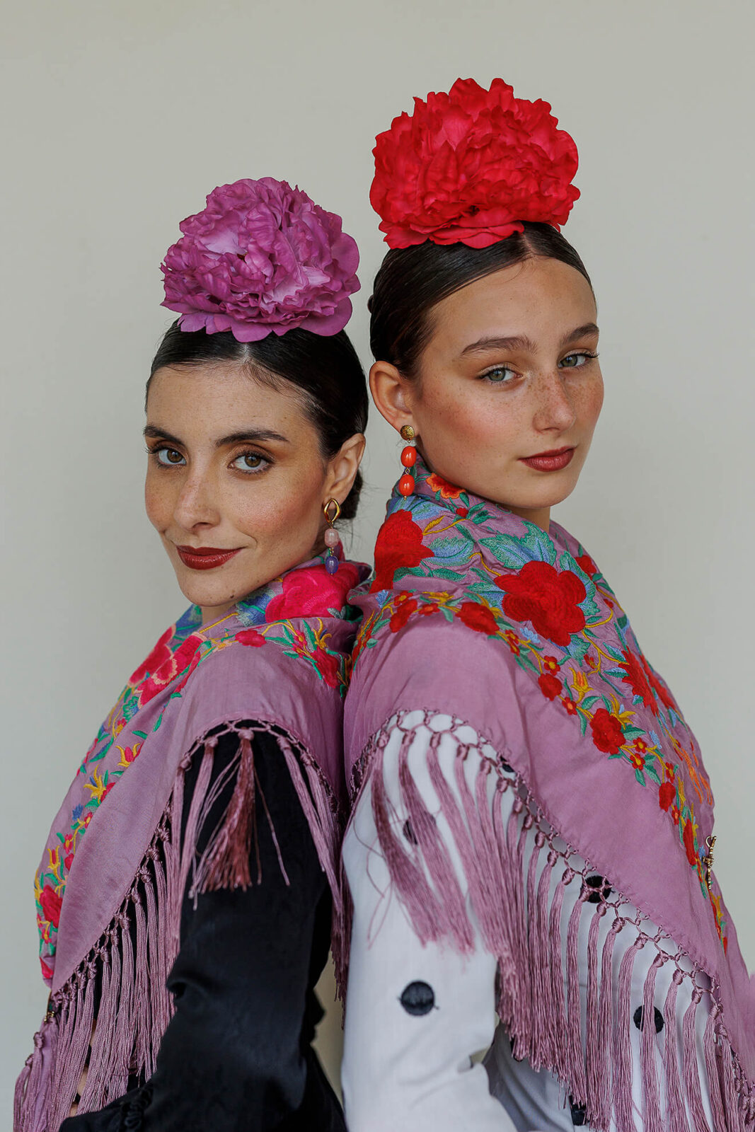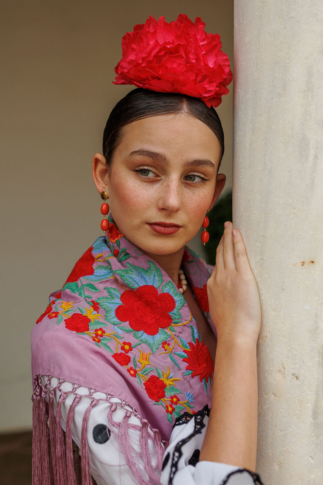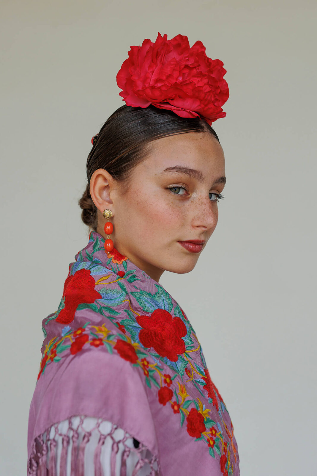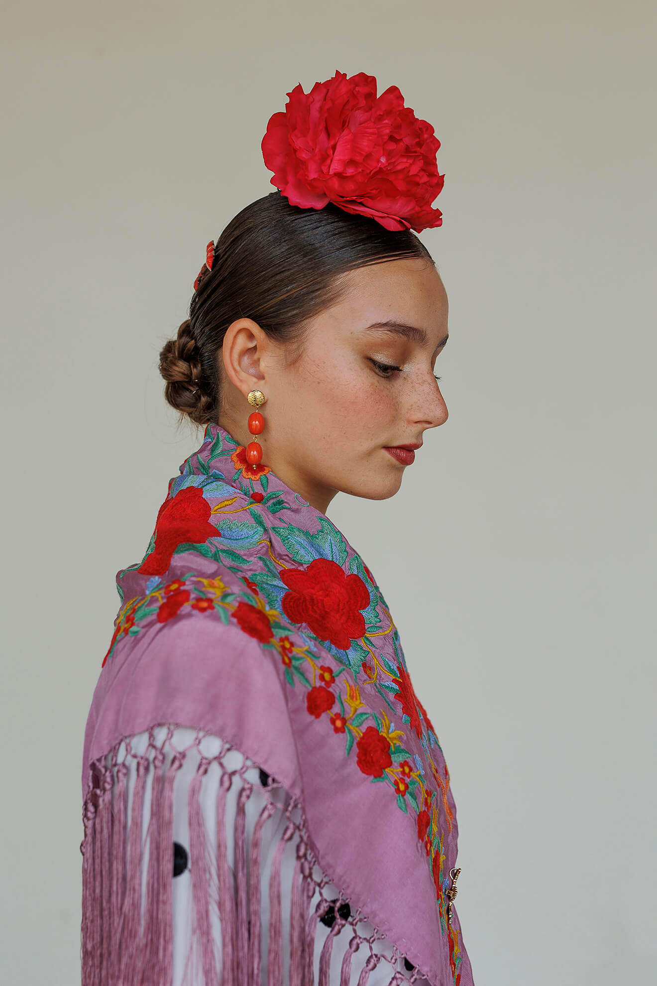 Look flamenca malva con rojo compuesto por mantoncillo bordado exclusivo Darwin, peonía coral y pendientes artesanales ligeros ideales para feria y romerías.