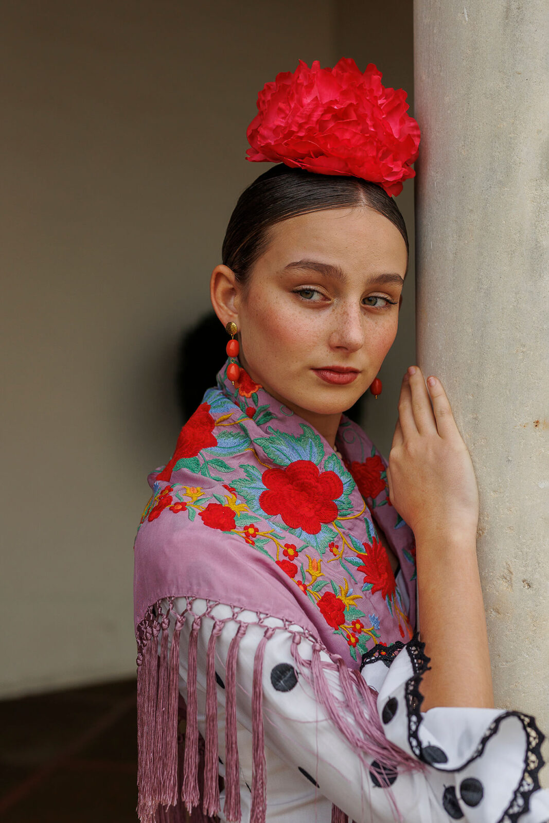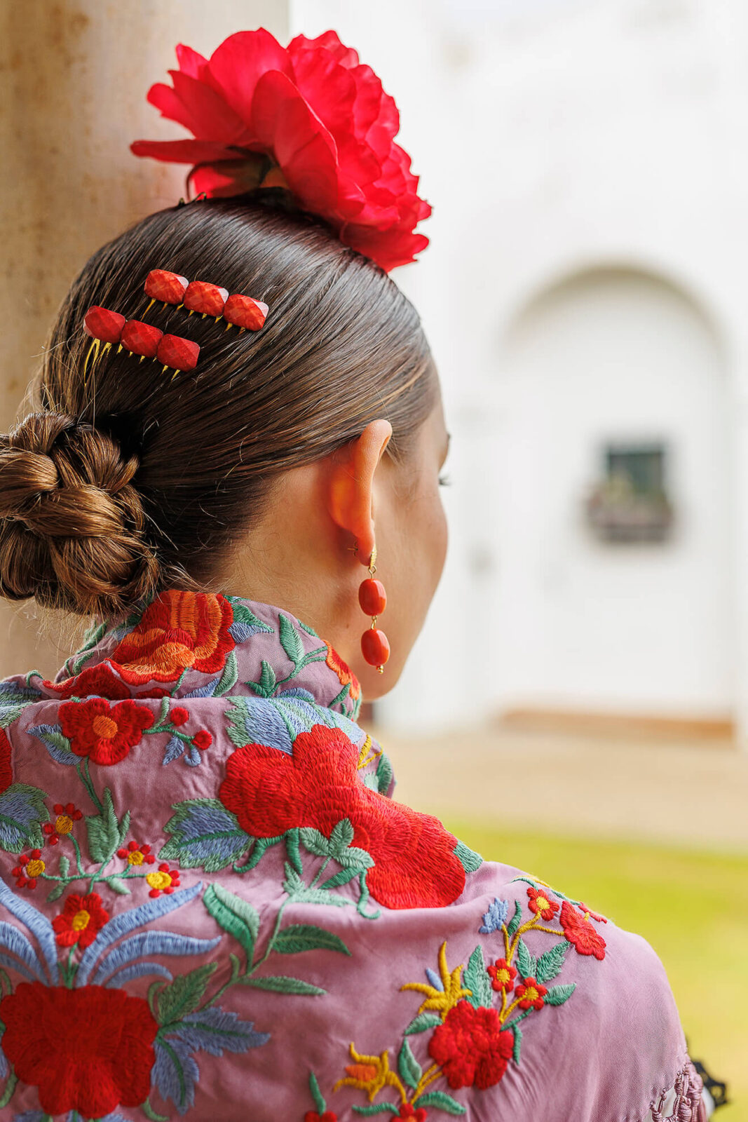 Este look está compuesto por tres piezas clave: un mantoncillo bordado exclusivo, una flor flamenca y unos pendientes montados artesanalmente. Tres elementos que juntos crean un conjunto muy especial.