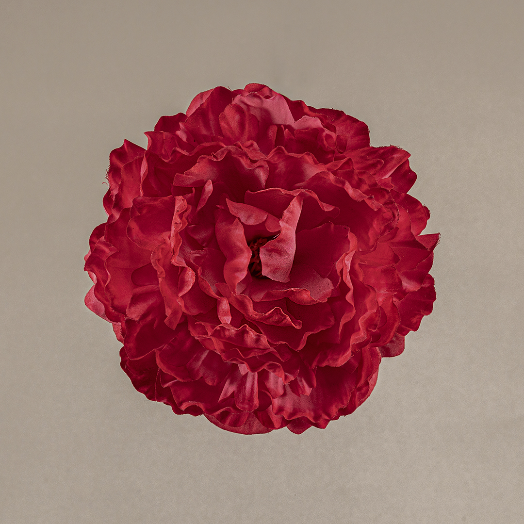 La segunda pieza que compone este look es una peonía flamenca de tamaño mediano en color coral. Es un tono un poco más suave que el rojo del bordado del mantoncillo, lo que crea un contraste muy bonito sin recargar el conjunto.