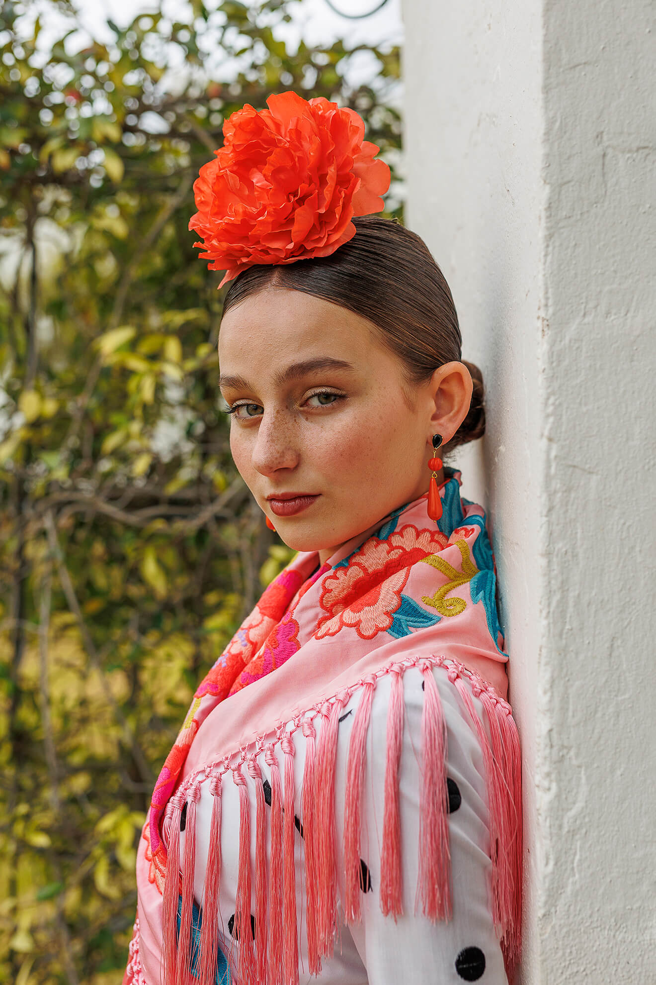 Look flamenca rosa coral Darwin – mantoncillo y flor