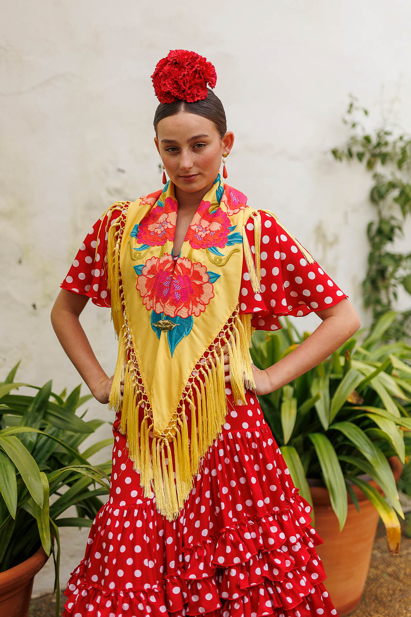Nuestro Mantón Carmen DW en color amarillo  es parte de la nueva colección flamenca 2025, que ya está llegando a nuestro almacén.