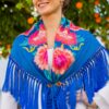 El mantoncillo Carmen DW azul klein es perfecto para cualquier look flamenco 2025. Un mantoncillo azul bordado en seda con colores y fleco de borlón.