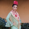 Este mantón presenta una gran cantidad de flores y ramas en la parte delantera de la seda, creando un patrón tradicional que realza la parte frontal del traje de flamenca. La parte trasera y el pico del mantón cuentan con una flor de gran tamaño y una pequeña cenefa , ofreciendo una elegancia atemporal.