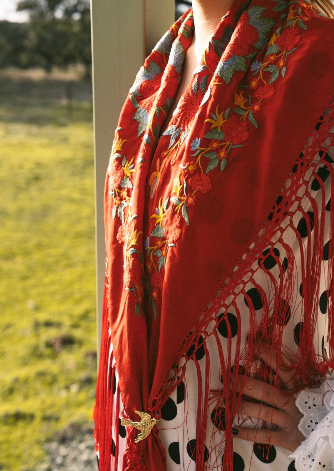 Este mantón nació de un boceto a mano alzada, que luego digitalizamos y perfeccionamos, eligiendo cuidadosamente los colores para el bordado y la seda teñida a mano. Su diseño es todo un homenaje a la Feria de Abril: dos grandes claveles en el centro, acompañados de una rosa grande y rodeado por una cenefa de flores que realza cada detalle del bordado.