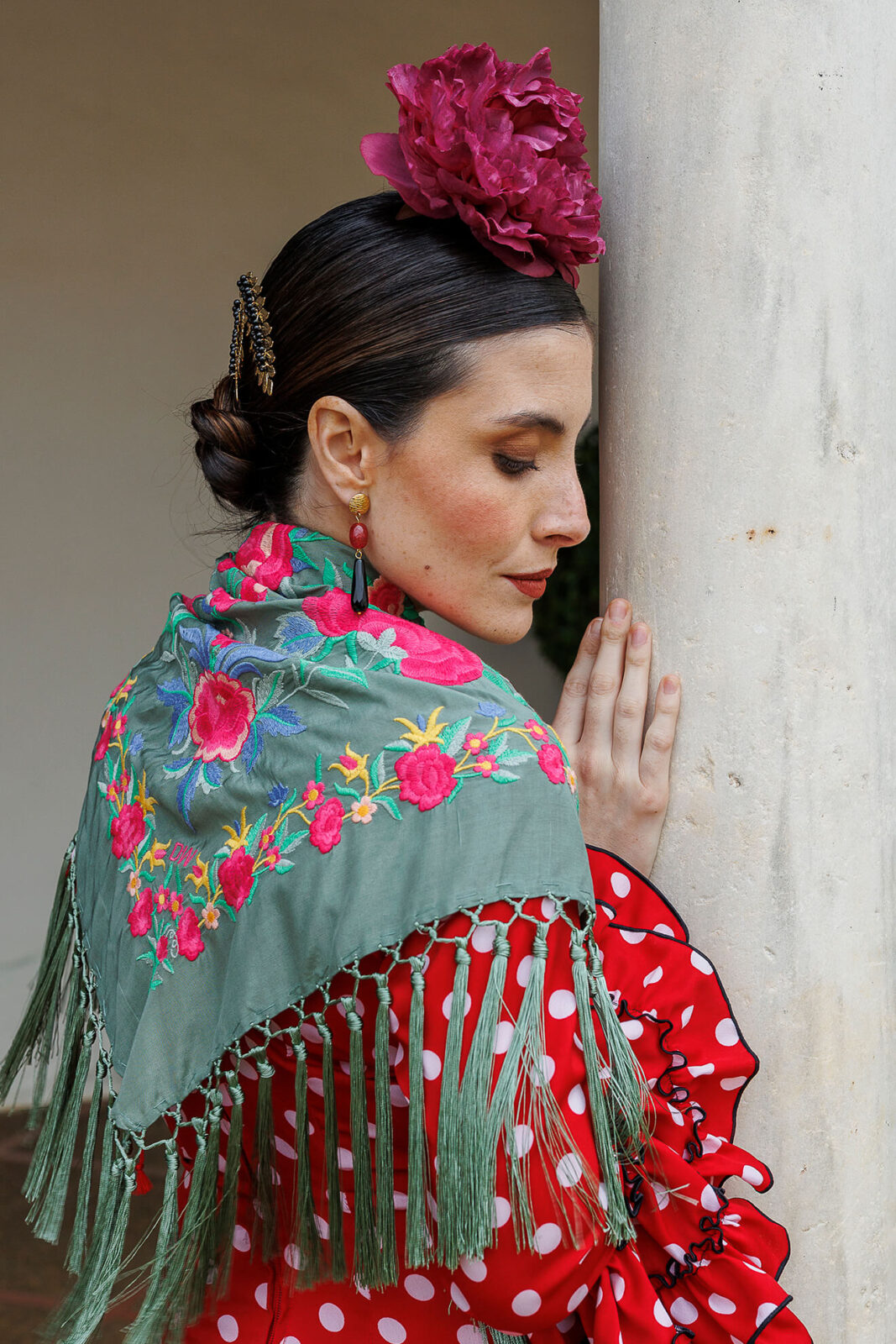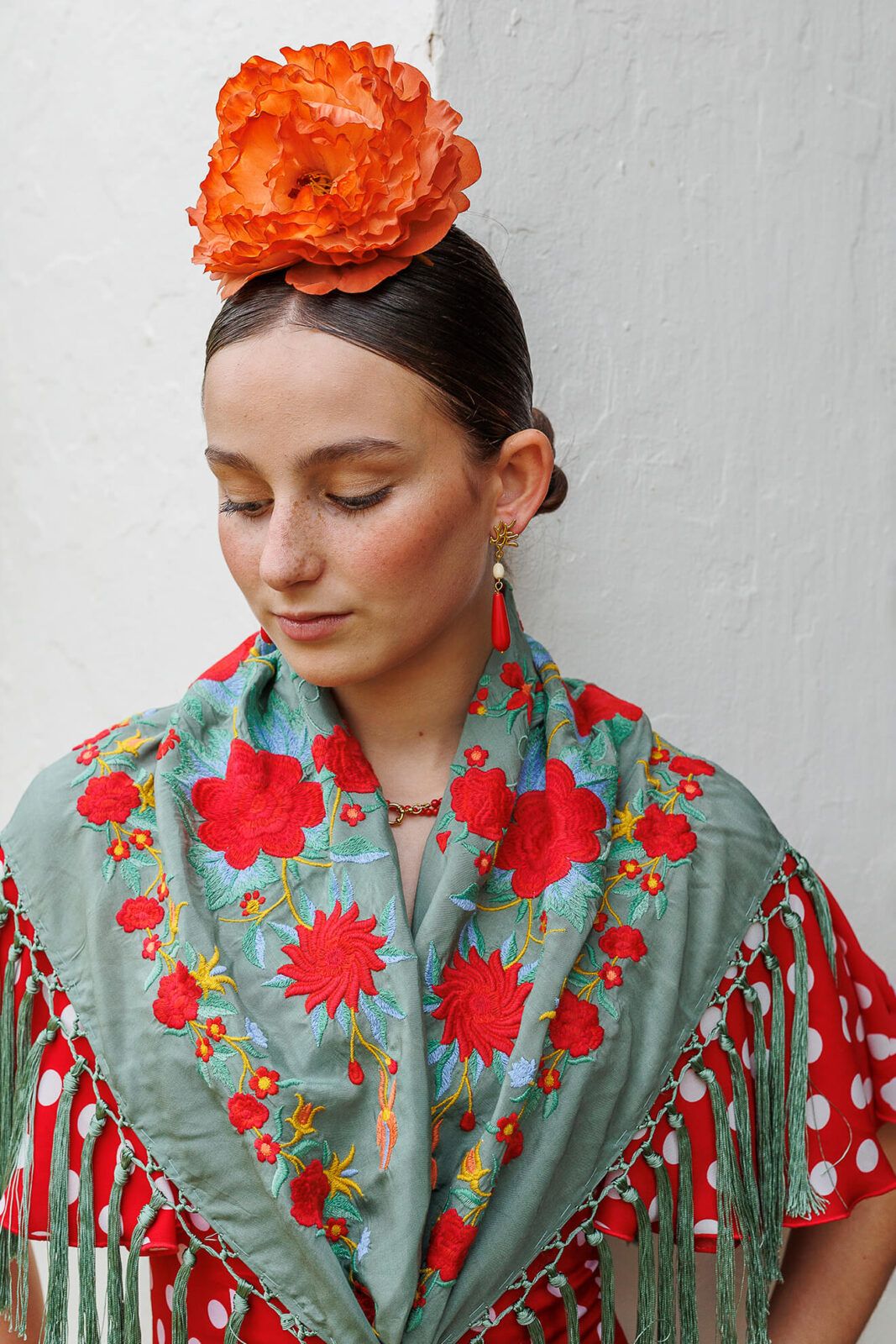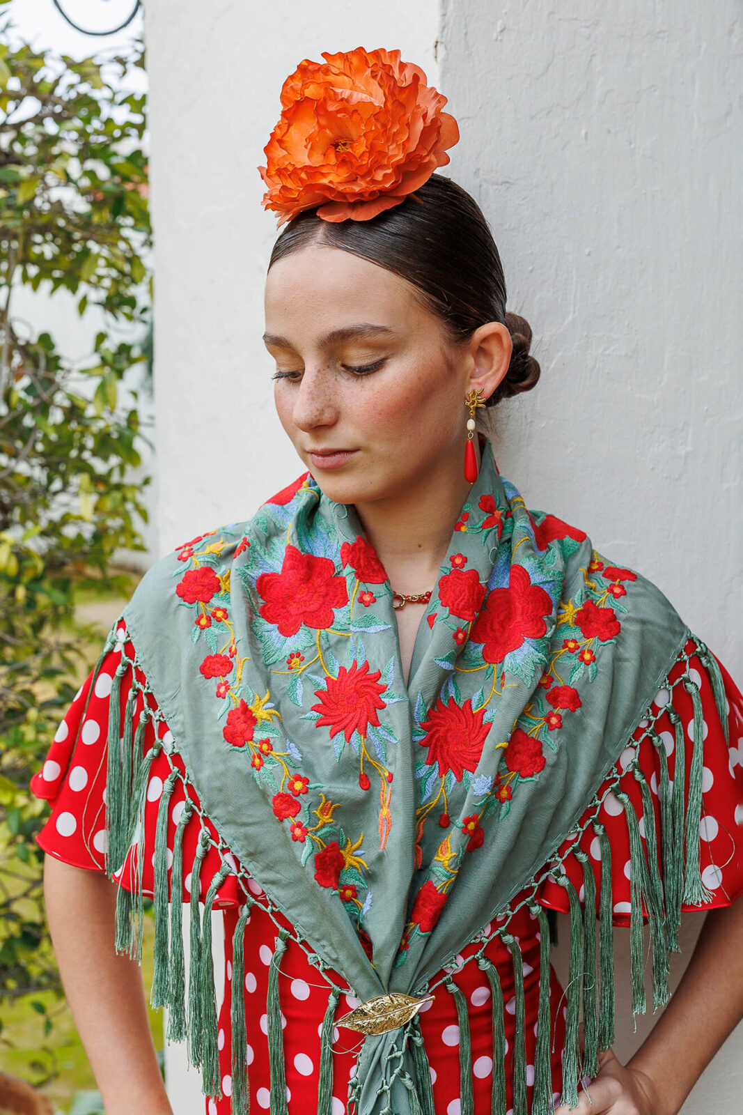 2.- Con el Mantoncillo Rosario  Verde jabonoso con bordado rojo lleva los Pendientes Siracusa en coral y de flor la Flor Flamenca Peonia Roja.