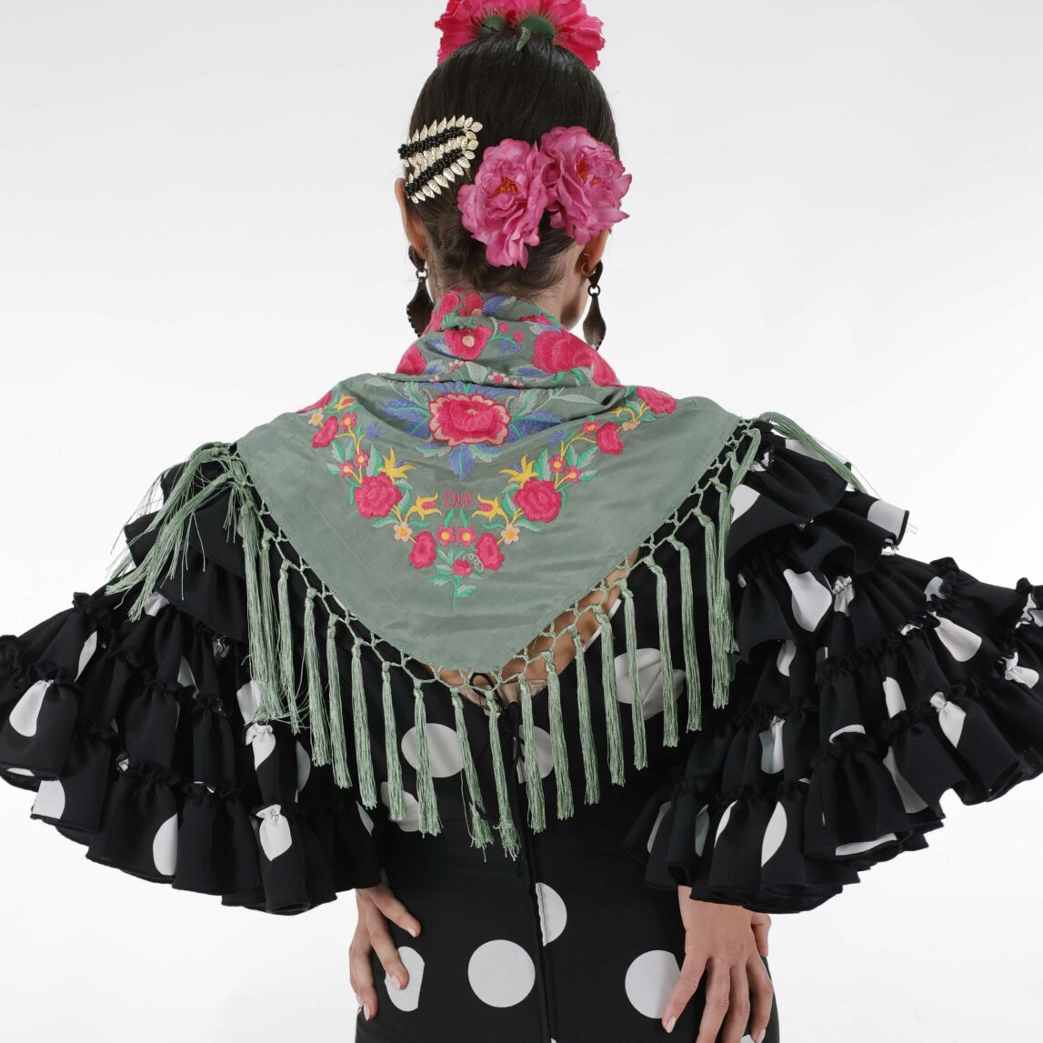 Si buscas un mantón con personalidad, diseño exclusivo y tradición, el Mantoncillo Rosario  DW verde jabonoso es para ti. Forma parte de nuestra Colección de Feria 2025 y está disponible en unidades limitadas, lo que lo convierte en una auténtica joya.