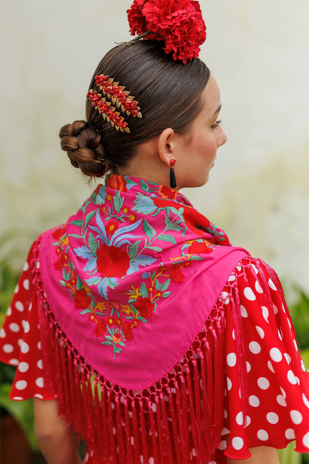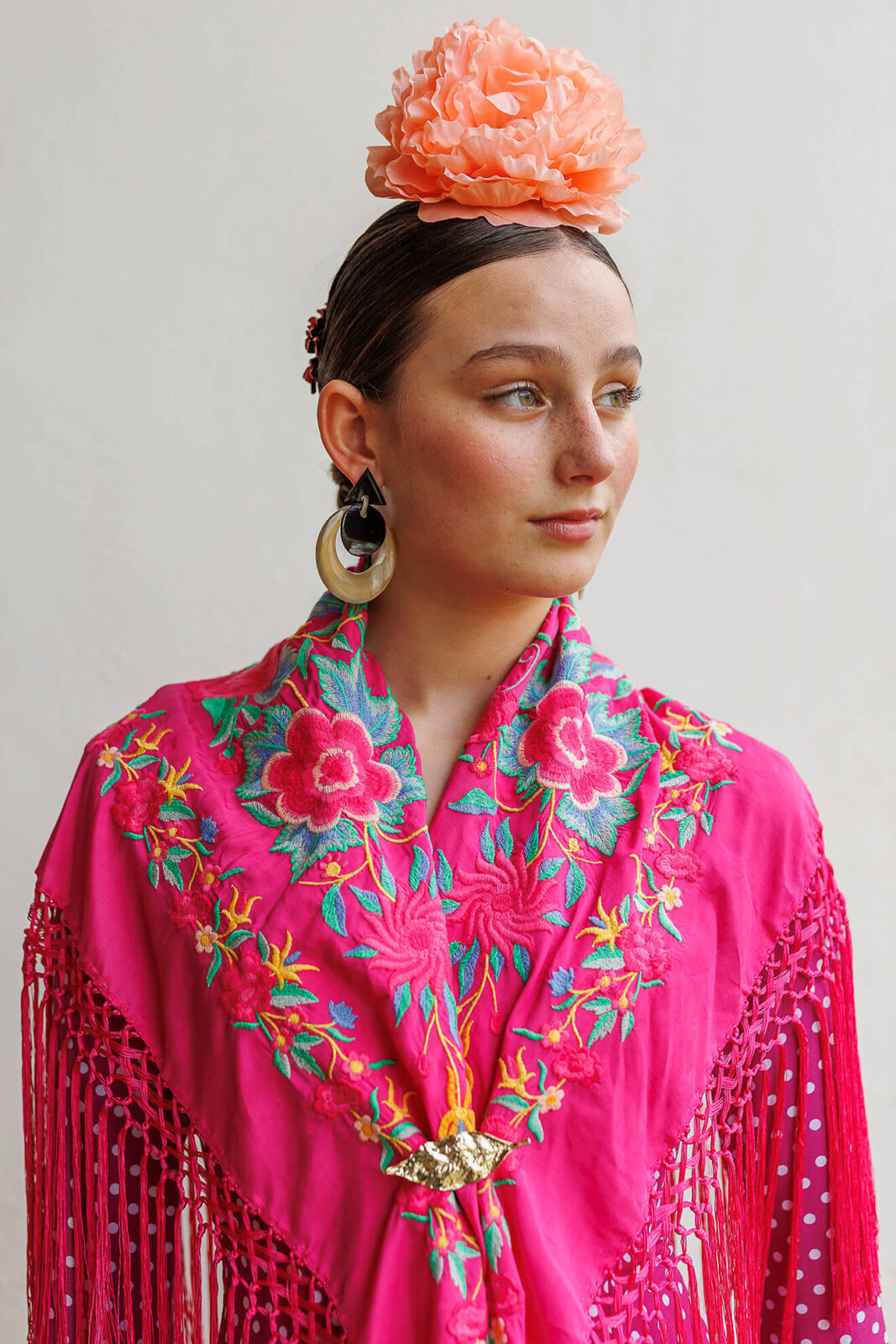 Este mantón nació de un boceto a mano alzada, que luego digitalizamos y perfeccionamos, eligiendo cuidadosamente los colores para el bordado y la seda teñida a mano. Su diseño es todo un homenaje a la Feria de Abril: dos grandes claveles en el centro, acompañados de una rosa grande y rodeado por una cenefa de flores que realza cada detalle del bordado.