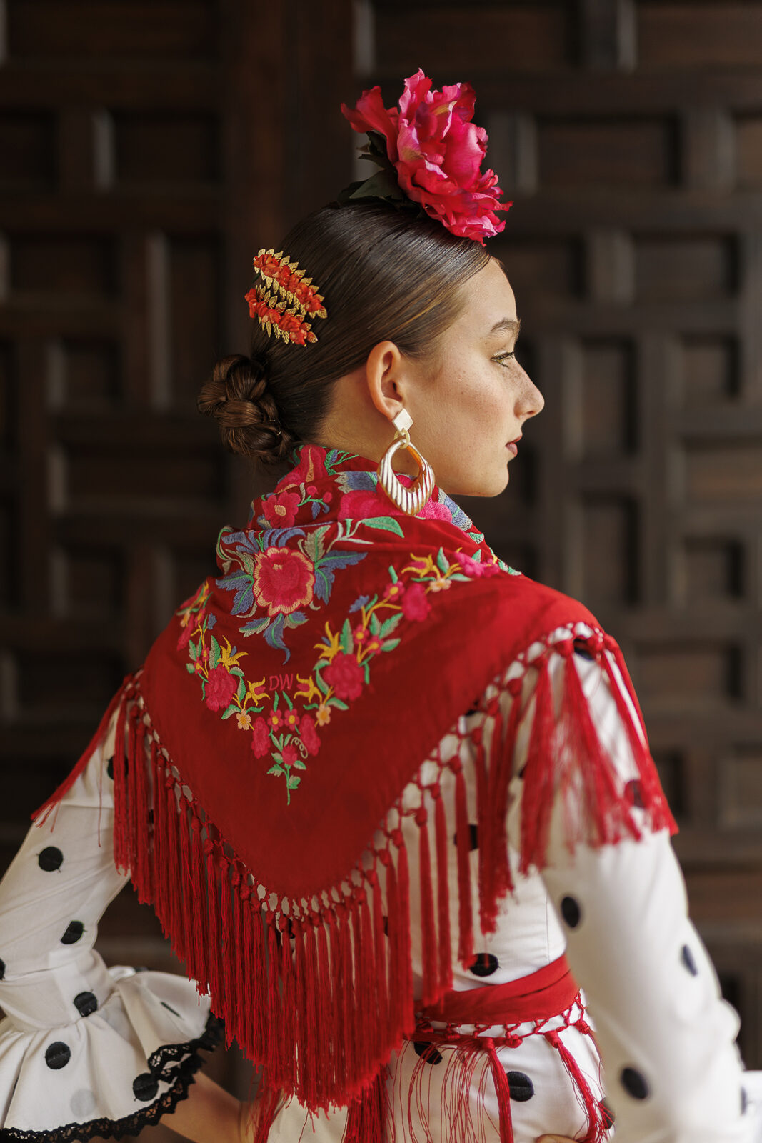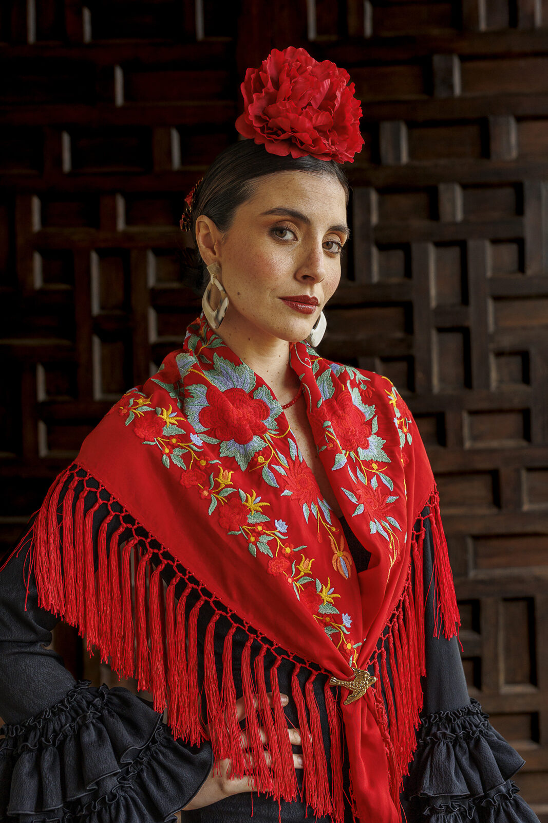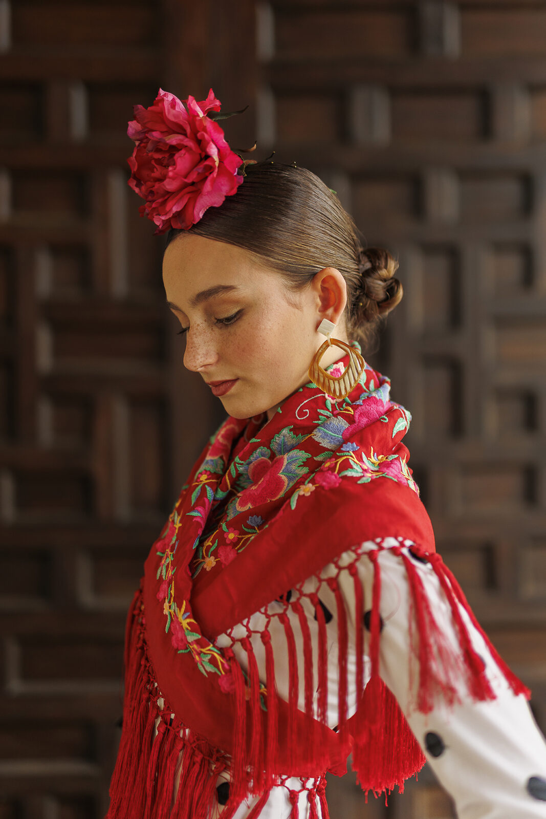 1.- Con el Mantoncillo Rosario DW rojo con bordado buganvilla lo puedes llevar con el Ramillete Claveles Buganvilla y losPendientes flamenca Dolores  o los Pendientes Antonella .
