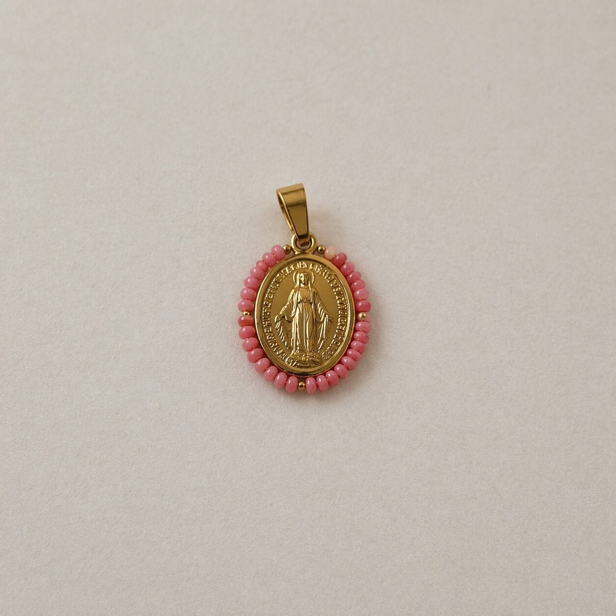 Medalla de la Virgen Milagrosa rodeada de coral rosa. En acero inoxidable, resistente al agua e ideal para pieles sensibles. Una joya que no querrás quitarte.