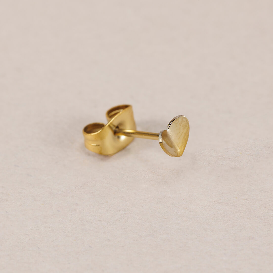 Su diseño minimalista en forma de corazón mide 0,4 x 0,45 cm, perfecto para darle un toque dulce y sutil a tu oreja sin recargar tu look. Disponible en dos acabados —color oro y color acero—, combina fácilmente con todo tipo de pendientes y estilos. El cierre es de tuerca, seguro y cómodo, ideal para llevarlo a diario sin preocuparte.