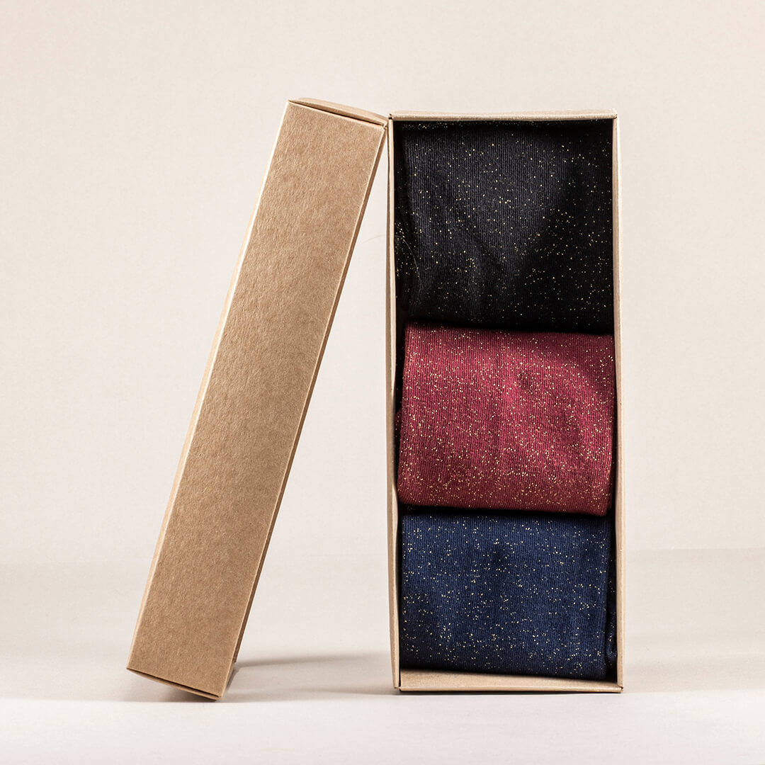 Pack de 3 calcetines de purpurina de media caña, tejidos en algodón con hilo metalizado. Cómodos, suaves y no pican. Disponibles en colores elegantes como verde, azul, burdeos, gris o marrón chocolate. Talla 35–41.