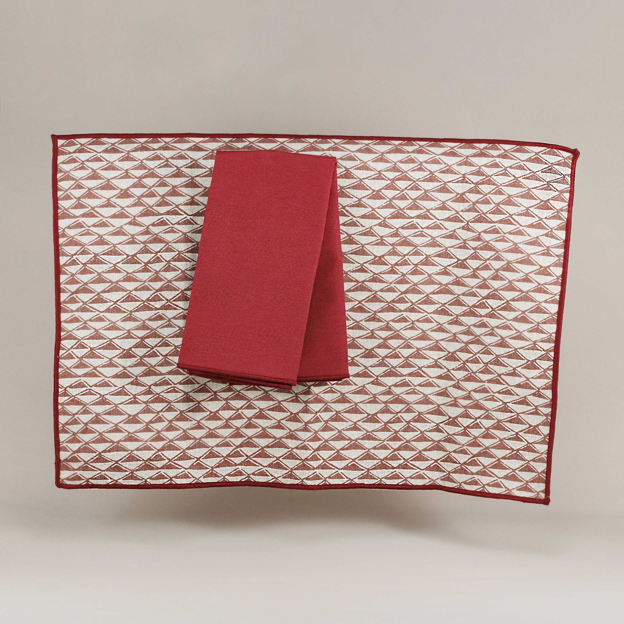El diseño de Pirámides destaca por su patrón geométrico único en tonos rojos y beige que aporta un aire contemporáneo y cálido a tu comedor. Su textura suave y resistente garantiza durabilidad y fácil mantenimiento, siendo perfecto tanto para el uso diario como para ocasiones especiales.