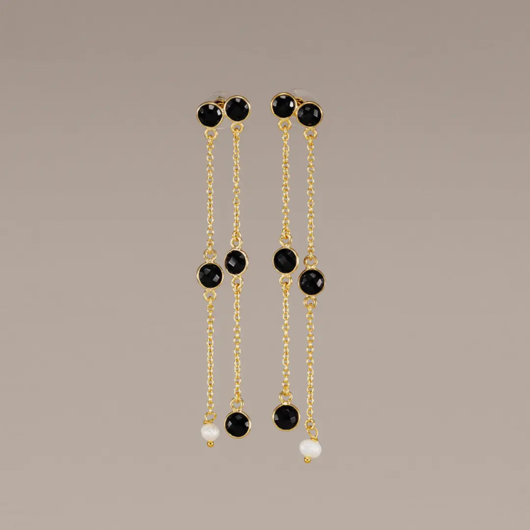 Estos pendientes largos de invitada se componen de dos cadenas finas de eslabones dorados, adornadas con circonitas, perlas de río y piedras naturales de obsidiana. Son piezas que destacan por su movimiento, reflejos y delicadeza. A pesar de su diseño alargado, no pesan nada, por lo que resultan comodísimos para llevar durante horas. Incorporan cierre de tornillo, seguro y discreto, perfecto para quienes buscan comodidad sin renunciar al estilo.