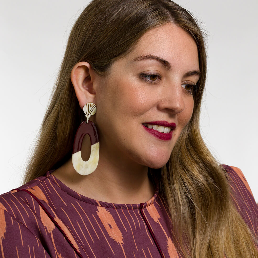 Su diseño XL no pasa desapercibido. Son pendientes grandes, con forma ovalada y abertura central, que estilizan muchísimo el rostro. La parte superior redonda conecta con una pieza alargada que combina el acabado natural del asta con un toque de color esmaltado. Puedes elegir entre dos variaciones: marfil y burdeos o marfil y verde. Dos combinaciones sofisticadas, elegantes y muy favorecedoras.