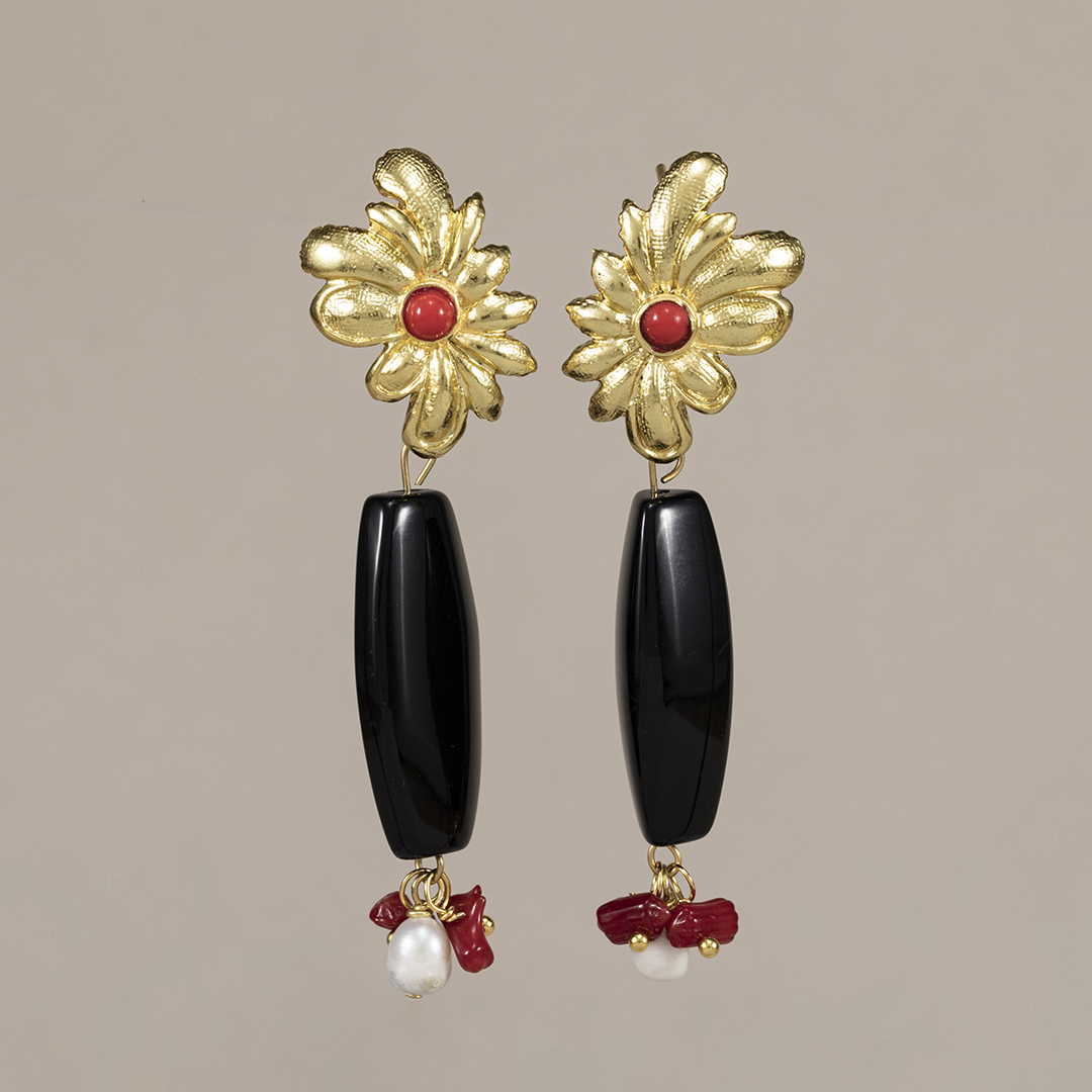 Pendientes flamenca Pasión en baño de oro 18K con piedra roja central, pieza negra y charms de coral y perla. Diseño exclusivo Darwin, montados a mano.